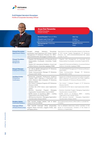 Riwayat PenunjukanAppointment HistoryDiangkat sebagai Sekretaris Perusahaan berdasarkan Surat Keputusan SVP Human Capital Management PT Pertamina (Persero) No. SKMJ00231/K20000/2021-S8 tanggal 12 Oktober 2021.Appointed as Corporate Secretary based on the Decree of SVP Human Capital Management PT Pertamina (Persero) No. SKMJ-00231/K20000/2021-S8 dated October 12, 2021.Riwayat PendidikanEducational Background%u2022 Magister (S2) Management of Corporate Social Responsibility (Cumlaude), Universitas Trisakti (2013).%u2022 Sarjana (S1) International Relations, Social and Political Science, Universitas Jayabaya (1998).%u2022 Magister (S2) Management of Corporate Social Responsibility (Cumlaude), Universitas Trisakti (2013).%u2022 Sarjana (S1) International Relations, Social and Political Science, Universitas Jayabaya (1998).Riwayat PekerjaanEmployment History%u2022 VP CSR & SMEPP Management PT Pertamina (Persero) (2019-2021).%u2022 Media Communication Manager PT Pertamina (Persero) (2017-2019).%u2022 VP CSR & SMEPP Management PT Pertamina (Persero) (2019-2021).%u2022 Media Communication Manager PT Pertamina (Persero) (2017-2019).Sertifikasi ProfesiProfessional Certification%u2022 Pertamina%u2019s Graduate Professional Guidance Program (BPS) majoring in Government and Public Relations (Best Graduate), PT Pertamina (Persero) (2001).%u2022 The Cohort 1 Catalyser Program of PT Pertamina (Persero) (2019).%u2022 Certified ISO 37101 Senior Lead Implementer (2024)%u2022 Business Essentials Program Managing Organization Transformation Course (2024)%u2022 BUMN School of Excellence (BSE) - Leading Organizations and Change (2024)%u2022 BSE Business Essential - Managing Organization Transformation Stream (2024) %u2022 Pertamina's Graduate Professional Guidance Program (BPS) majoring in Government and Public Relations (Best Graduate), PT Pertamina (Persero) (2001).%u2022 The Cohort 1 Catalyser Program of PT Pertamina (Persero) (2019).%u2022 Certified ISO 37101 Senior Lead Implementer (2024)%u2022 Business Essentials Program Managing Organization Transformation Course (2024)%u2022 BUMN School of Excellence (BSE) - Leading Organizations and Change (2024)%u2022 BSE Business Essential - Managing Organization Transformation Stream (2024) Rangkap JabatanConcurrent PositionsTidak memiliki rangkap jabatan, baik di dalam maupun di luar Perusahaan.Not holding dual positions, either within or outside the Company.Hubungan AfiliasiAffiliated RelationshipsTidak memiliki hubungan afiliasi dengan/atau anggota Dewan Komisaris, anggota Direksi, atau pemegang saham.Has no affiliated relationship with/or members of the Board of Commissioners, members of the Board of Directors, or shareholders.Arya Dwi ParamitaSekretaris PerusahaanCompany SecretaryPeriode Menjabat / Terms of Office Usia / AgeMenjabat sejak 16 April 2021Serving since April 16, 202147 tahun47 years oldKewarganegaraan / Citizenship Domisili / DomicileIndonesia BogorProfil Pejabat Sekretaris PerusahaanProfile of Corporate Secretary OfficerLaporan Tahunan %u2022 Annual Report 516HULU ENERGI
