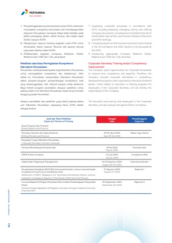 7. Menyelenggarakan proses korporasi sesuai GCG, antara lain menyiapkan, mengelola, menyimpan, dan mendayagunakan dokumen Perusahaan, termasuk tetapi tidak terbatas pada daftar pemegang saham, daftar khusus, dan risalah rapat Direksi maupun RUPS.8. Menghimpun laporan tentang kegiatan usaha PHE untuk dimasukkan dalam Laporan Tahunan dan laporan lainnya yang akan dibahas dalam RUPS.9. Melaksanakan kegiatan Company Relations (Public Relations dan CSR) dan TJSL yang tepat.Pelatihan dan/atau Peningkatan Kompetensi Sekretaris PerusahaanPerusahaan membuka kesempatan bagi Sekretaris Perusahaan untuk meningkatkan kompetensi dan keahliannya. Oleh sebab itu, Perusahaan menyertakan Sekretaris Perusahaan dalam program-program pengembangan kompetensi, baik yang diselenggarakan oleh internal maupun pihak eksternal. Biaya terkait program pendidikan ataupun pelatihan untuk pekerja dalam unit Sekretaris Perusahaan sepenuhnya menjadi tanggung jawab Perusahaan.Adapun pendidikan dan pelatihan yang diikuti pekerja dalam unit Sekretaris Perusahaan sepanjang tahun 2024 adalah sebagai berikut.7. Organizing corporate processes in accordance with GCG, including preparing, managing, storing, and utilizing Company documents, including but not limited to the list of shareholders, special lists, and minutes of Board of Directors and GMS meetings.8. Compiling reports on PHE business activities to be included in the Annual Report and other reports to be discussed at the GMS.9. Conducting appropriate Company Relations (Public Relations and CSR) and TJSL activities.Corporate Secretary Training and/or Competency ImprovementThe Company opens opportunities for Corporate Secretaries to improve their competence and expertise. Therefore, the Company includes Corporate Secretaries in competency development programs, both organized by internal and external parties. Costs related to education or training programs for employees in the Corporate Secretary unit are entirely the responsibility of the Company.The education and training that employees in the Corporate Secretary unit will undergo throughout 2024 is as follows.Jenis dan Tema PelatihanTypes and Themes of TrainingTanggalDatePenyelenggaraOrganizerBoard Support dan ProtokolBoard Support and ProtocolPenulisan Notulen dan KeprotokoleranWriting Minutes and Protocol29-30 April 2024April 29-30, 2024Patrari Jaya UtamaKaryawan Fungsi Sekretaris PerusahaanCorporate Secretary Function EmployeePersonal Branding by Fernando Edo 8 Mei 2024May 8, 2024Fernando EdoSMAP & New Compols 22 Juli 2024July 22, 2024Compliance PHEStakeholder Mapping & Management 20-22 Agustus 2024August 20-22, 2024Indonesia IndicatorPenyelesaian Kewajiban BAST Blok terminasi/divestasi, Lesson Learned Aspek Compliance Proses Carve Out Rantau FieldSettlement of BAST Obligations for Termination/Divestment Blocks, Lessons Learned in Compliance Aspects of the Rantau Field Carve Out Process27 Agustus 2024August 27, 2024Regional 1Inovasi Adaptasi & Mitigasi Perubahan Iklim melalui Pemberdayaan Masyarakat PesisirClimate Change Adaptation & Mitigation Innovation through Coastal Community Empowerment30 September 2024September 30, 2024Regional 4Laporan Tahunan %u2022 Annual Report 518HULU ENERGI
