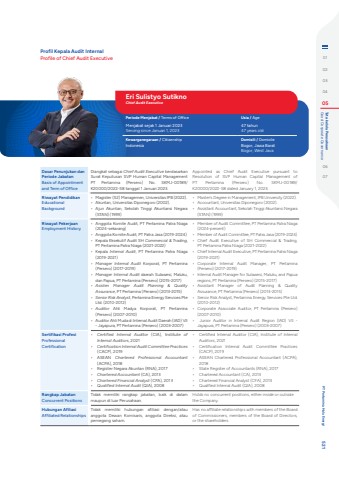 Dasar Penunjukan dan Periode JabatanBasis of Appointment and Term of OfficeDiangkat sebagai Chief Audit Executive berdasarkan Surat Keputusan SVP Human Capital Management PT Pertamina (Persero) No. SKMJ-00189/K20000/2022-S8 tanggal 1 Januari 2023.Appointed as Chief Audit Executive pursuant to Resolution of SVP Human Capital Management of PT Pertamina (Persero) No. SKMJ-00189/K20000/2022-S8 dated January 1, 2023.Riwayat PendidikanEducational Background%u2022 Magister (S2) Managemen, Universitas IPB (2022).%u2022 Akuntan, Universitas Diponegoro (2002).%u2022 Ajun Akuntan, Sekolah Tinggi Akuntansi Negara (STAN) (1999)%u2022 Master's Degree in Management, IPB University (2022).%u2022 Accountant, Universitas Diponegoro (2002).%u2022 Assistant Accountant, Sekolah Tinggi Akuntansi Negara (STAN) (1999)Riwayat PekerjaanEmployment History%u2022 Anggota Komite Audit, PT Pertamina Patra Niaga (2024-sekarang)%u2022 Anggota Komite Audit, PT Patra Jasa (2019-2024)%u2022 Kepala Eksekutif Audit SH Commercial & Trading, PT Pertamina Patra Niaga (2021-2022)%u2022 Kepala Internal Audit, PT Pertamina Patra Niaga (2019-2021)%u2022 Manager Internal Audit Korporat, PT Pertamina (Persero) (2017-2019)%u2022 Manager Internal Audit daerah Sulawesi, Maluku, dan Papua, PT Pertamina (Persero) (2015-2017)%u2022 Asisten Manager Audit Planning & Quality Assurance, PT Pertamina (Persero) (2013-2015)%u2022 Senior Risk Analyst, Pertamina Energy Services Pte Ltd. (2010-2012)%u2022 Auditor Ahli Madya Korporat, PT Pertamina (Persero) (2007-2010)%u2022 Auditor Ahli Muda di Internal Audit Daerah (IAD) VII - Jayapura, PT Pertamina (Persero) (2003-2007)%u2022 Member of Audit Committee, PT Pertamina Patra Niaga (2024-present)%u2022 Member of Audit Committee, PT Patra Jasa (2019-2024)%u2022 Chief Audit Executive of SH Commercial & Trading, PT Pertamina Patra Niaga (2021-2022)%u2022 Chief Internal Audit Executive, PT Pertamina Patra Niaga (2019-2021)%u2022 Corporate Internal Audit Manager, PT Pertamina (Persero) (2017-2019)%u2022 Internal Audit Manager for Sulawesi, Maluku, and Papua regions, PT Pertamina (Persero) (2015-2017)%u2022 Assistant Manager of Audit Planning & Quality Assurance, PT Pertamina (Persero) (2013-2015)%u2022 Senior Risk Analyst, Pertamina Energy Services Pte Ltd. (2010-2012)%u2022 Corporate Associate Auditor, PT Pertamina (Persero) (2007-2010)%u2022 Junior Auditor in Internal Audit Region (IAD) VII - Jayapura, PT Pertamina (Persero) (2003-2007)Sertifikasi ProfesiProfessional Certification%u2022 Certified Internal Auditor (CIA), Institute of Internal Auditors, 2021%u2022 Certification Internal Audit Committee Practices (CACP), 2019%u2022 ASEAN Chartered Professional Accountant (ACPA), 2018%u2022 Register Negara Akuntan (RNA), 2017%u2022 Chartered Accountant (CA), 2013%u2022 Chartered Financial Analyst (CFA), 2013%u2022 Qualified Internal Audit (QIA), 2008%u2022 Certified Internal Auditor (CIA), Institute of Internal Auditors, 2021%u2022 Certification Internal Audit Committee Practices (CACP), 2019%u2022 ASEAN Chartered Professional Accountant (ACPA), 2018%u2022 State Register of Accountants (RNA), 2017%u2022 Chartered Accountant (CA), 2013%u2022 Chartered Financial Analyst (CFA), 2013%u2022 Qualified Internal Audit (QIA), 2008Rangkap JabatanConcurrent PositionsTidak memiliki rangkap jabatan, baik di dalam maupun di luar Perusahaan.Holds no concurrent positions, either inside or outside the Company.Hubungan AfiliasiAffiliated RelationshipsTidak memiliki hubungan afiliasi dengan/atau anggota Dewan Komisaris, anggota Direksi, atau pemegang saham.Has no affiliate relationships with members of the Board of Commissioners, members of the Board of Directors, or the shareholdersEri Sulistyo SutiknoChief Audit ExecutivePeriode Menjabat / Terms of Office Usia / AgeMenjabat sejak 1 Januari 2023Serving since Januari 1, 202347 tahun47 years oldKewarganegaraan / Citizenship Domisili / DomicileIndonesia Bogor, Jawa BaratBogor, West JavaProfil Kepala Audit InternalProfile of Chief Audit Executive 0102030405 Good Corporate Governance Tata kelola Perusahaan0607 PT Pertamina Hulu Energi 521