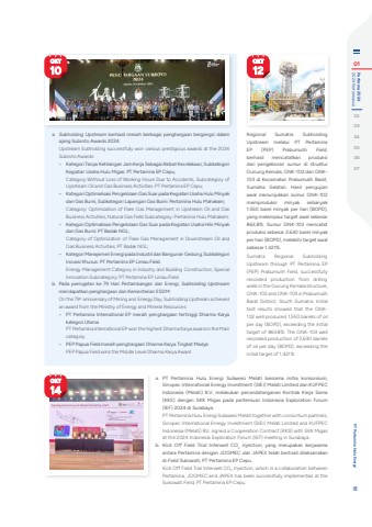 OKT10OKT12a. Subholding Upstream berhasil meraih berbagai penghargaan bergengsi dalam ajang Subroto Awards 2024:Upstream Subholding successfully won various prestigious awards at the 2024 Subroto Awards:%u2022 Kategori Tanpa Kehilangan Jam Kerja Sebagai Akibat Kecelakaan, Subkategori Kegiatan Usaha Hulu Migas: PT Pertamina EP Cepu;Category Without Loss of Working Hours Due to Accidents, Subcategory of Upstream Oil and Gas Business Activities: PT Pertamina EP Cepu;%u2022 Kategori Optimalisasi Pengelolaan Gas Suar pada Kegiatan Usaha Hulu Minyak dan Gas Bumi, Subkategori Lapangan Gas Bumi: Pertamina Hulu Mahakam;Category: Optimization of Flare Gas Management in Upstream Oil and Gas Business Activities, Natural Gas Field Subcategory: Pertamina Hulu Mahakam;%u2022 Kategori Optimalisasi Pengelolaan Gas Suar pada Kegiatan Usaha Hilir Minyak dan Gas Bumi: PT Badak NGL;Category of Optimization of Flare Gas Management in Downstream Oil and Gas Business Activities: PT Badak NGL;%u2022 Kategori Manajemen Energi pada Industri dan Bangunan Gedung, Subkategori Inovasi Khusus: PT Pertamina EP Limau Field.Energy Management Category in Industry and Building Construction, Special Innovation Subcategory: PT Pertamina EP Limau Field.b. Pada peringatan ke 79 Hari Pertambangan dan Energi, Subholding Upstreammendapatkan penghargaan dan Kementerian ESDM:On the 79th anniversary of Mining and Energy Day, Subholding Upstream achieved an award from the Ministry of Energy and Mineral Resources:%u2022 PT Pertamina International EP meraih penghargaan tertinggi Dharma Karya kategori UtamaPT Pertamina International EP won the highest Dharma Karya award in the Main category%u2022 PEP Papua Field meraih penghargaan Dharma Karya Tingkat MadyaPEP Papua Field wins the Middle Level Dharma Karya AwardRegional Sumatra Subholding Upstream melalui PT Pertamina EP (PEP) Prabumulih Field, berhasil mencatatkan produksi dari pengeboran sumur di struktur Gunung Kemala, GNK-102 dan GNK103 di Kecamatan Prabumulih Barat, Sumatra Selatan. Hasil pengujian awal menunjukkan sumur GNK-102 memproduksi minyak sebanyak 1.550 barel minyak per hari (BOPD), yang melampaui target awal sebesar 863,8%. Sumur GNK-103 mencatat produksi sebesar 2.630 barel minyak per hari (BOPD), melebihi target awal sebesar 1.421%.Sumatra Regional Subholding Upstream through PT Pertamina EP (PEP) Prabumulih Field, successfully recorded production from drilling wells in the Gunung Kemala structure, GNK-102 and GNK-103 in Prabumulih Barat District, South Sumatra. Initial test results showed that the GNK102 well produced 1,550 barrels of oil per day (BOPD), exceeding the initial target of 863.8%. The GNK-103 well recorded production of 2,630 barrels of oil per day (BOPD), exceeding the initial target of 1,421%.a. PT Pertamina Hulu Energi Sulawesi Melati bersama mitra konsorsium, Sinopec International Energy Investment (SIEI) Melati Limited dan KUFPEC Indonesia (Melati) B.V, melakukan penandatanganan Kontrak Kerja Sama (KKS) dengan SKK Migas pada pertemuan Indonesia Exploration Forum (IEF) 2024 di Surabaya.PT Pertamina Hulu Energi Sulawesi Melati together with consortium partners, Sinopec International Energy Investment (SIEI) Melati Limited and KUFPEC Indonesia (Melati) BV, signed a Cooperation Contract (KKS) with SKK Migas at the 2024 Indonesia Exploration Forum (IEF) meeting in Surabaya.b. Kick Off Field Trial Interwell CO2 Injection, yang merupakan kerjasama antara Pertamina dengan JOGMEC dan JAPEX telah berhasil dilaksanakan di Field Sukowati, PT Pertamina EP Cepu.Kick Off Field Trial Interwell CO2 Injection, which is a collaboration between Pertamina, JOGMEC and JAPEX has been successfully implemented at the Sukowati Field, PT Pertamina EP Cepu.OKT1401 2024 Performance Performa 2024020304050607Laporan Tahunan %u2022 Annual Report 50PT Pertamina Hulu Energi 51