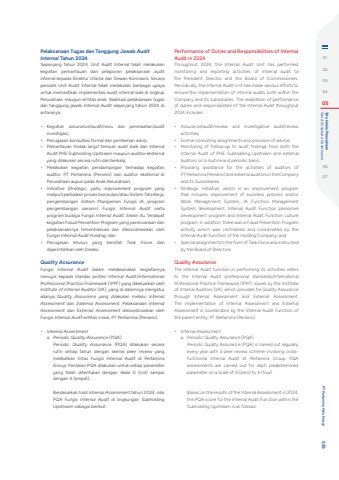 Pelaksanaan Tugas dan Tanggung Jawab Audit Internal Tahun 2024Sepanjang tahun 2024, Unit Audit Internal telah melakukan kegiatan pemantauan dan pelaporan pelaksanaan audit internal kepada Direktur Utama dan Dewan Komisaris. Secara periodik Unit Audit Internal telah melakukan berbagai upaya untuk memastikan implementasi audit internal baik di lingkup Perusahaan maupun entitas anak. Realisasi pelaksanaan tugas dan tanggung jawab Internal Audit sepanjang tahun 2024 di antaranya:%u2022 Kegiatan assurance/audit/reviu dan penelaahan/audit investigasi;%u2022 Penugasan konsultasi formal dan pemberian advis;%u2022 Pemantauan tindak lanjut temuan audit baik dari Internal Audit PHE Subholding Upstream maupun auditor eksternal yang dilakukan secara rutin dan berkala;%u2022 Melakukan kegiatan pendampingan terhadap kegiatan auditor PT Pertamina (Persero) dan auditor eksternal di Perusahaan aupun pada Anak Perusahaan;%u2022 Initiative Strategic, yaitu improvement program yang meliputi perbaikan proses bisnis dan/atau Sistem Tata Kerja, pengembangan Sistem Manajemen Fungsi IA, program pengembangan personil Fungsi Internal Audit serta program budaya Fungsi Internal Audit. Selain itu, terdapat kegiatan Fraud Prevention Program yang perencanaan dan pelaksanaannya tersentralisasi dan dikoordinasikan oleh Fungsi Internal Audit Holding; dan%u2022 Penugasan khusus yang bersifat Task Force dan diperintahkan oleh Direksi. Quality AssuranceFungsi Internal Audit dalam melaksanakan kegiatannya merujuk kepada standar profesi Internal Audit/International Professional Practice Framework (IPPF) yang dikeluarkan oleh Institute of Internal Auditor (IIA), yang di dalamnya mengatur adanya Quality Assurance yang dilakukan melalui Internal Assessment dan External Assessment. Pelaksanaan Internal Assessment dan External Assessment dikoordinasikan oleh Fungsi Internal Audit entitas induk, PT Pertamina (Persero).%u2022 Internal Assessmenta. Periodic Quality Assurance (PQA)Periodic Quality Assurance (PQA) dilakukan secara rutin setiap tahun dengan skema peer review yang melibatkan lintas Fungsi Internal Audit di Pertamina Group. Penilaian PQA dilakukan untuk setiap parameter yang telah ditentukan dengan skala 0 (nol) sampai dengan 4 (empat). Berdasarkan hasil Internal Assessment tahun 2024, nilai PQA Fungsi Internal Audit di lingkungan Subholding Upstream sebagai berikut:Performance of Duties and Responsibilities of Internal Audit in 2024Throughout 2024, the Internal Audit Unit has performed monitoring and reporting activities of internal audit to the President Director and the Board of Commissioners. Periodically, the Internal Audit Unit has made various efforts to ensure the implementation of internal audits both within the Company and its subsidiaries. The realization of performance of duties and responsibilities of the Internal Audit throughout 2024 includes:%u2022 Assurance/audit/review and investigative audit/review activities;%u2022 Formal consulting assignments and provision of advice;%u2022 Monitoring of follow-up to audit findings from both the Internal Audit of PHE Subholding Upstream and external auditors on a routine and periodic basis;%u2022 Providing assistance for the activities of auditors of PT Pertamina (Persero) and external auditors in the Company and its Subsidiaries;%u2022 Strategic Initiative, which is an improvement program that includes improvement of business process and/or Work Management System, IA Function Management System development, Internal Audit Function personnel development program and Internal Audit Function culture program. In addition, there was a Fraud Prevention Program activity which was centralized and coordinated by the Internal Audit Function of the Holding Company; and%u2022 Special assignments in the form of Task Force and instructed by the Board of Directors. Quality AssuranceThe Internal Audit function in performing its activities refers to the Internal Audit professional standards/International Professional Practice Framework (IPPF) issued by the Institute of Internal Auditors (IIA), which provides for Quality Assurance through Internal Assessment and External Assessment. The implementation of Internal Assessment and External Assessment is coordinated by the Internal Audit Function of the parent entity, PT Pertamina (Persero).%u2022 Internal Assessmenta. Periodic Quality Assurance (PQA)Periodic Quality Assurance (PQA) is carried out regularly every year with a peer review scheme involving crossfunctional Internal Audit at Pertamina Group. PQA assessments are carried out for each predetermined parameter on a scale of 0 (zero) to 4 (four). Based on the results of the Internal Assessment in 2024, the PQA score for the Internal Audit Function within the Subholding Upstream is as follows:0102030405 Good Corporate Governance Tata kelola Perusahaan0607 PT Pertamina Hulu Energi 529
