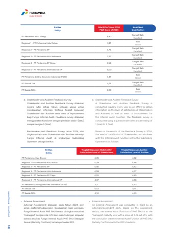 b. Stakeholder and Auditee Feedback SurveyStakeholder and Auditee Feedback Survey dilakukan secara rutin setiap tahun sebagai upaya untuk mendapatkan informasi tentang tingkat kepuasan Stakeholder dan Auditee serta area of improvementbagi Fungsi Internal Audit. Feedback survey dilakukan menggunakan kuesioner dengan penilaian skala 1 (satu) sampai dengan 5 (lima). Berdasarkan hasil Feedback Survey tahun 2024, nilai tingkatan kepuasan Stakeholder dan Auditee terhadap Fungsi Internal Audit di lingkungan Subholding Upstream sebagai berikut:b. Stakeholder and Auditee Feedback SurveyA Stakeholder and Auditee Feedback Survey is conducted regularly every year as an effort to obtain information on the level of satisfaction of Stakeholders and Auditees as well as areas of improvement for the Internal Audit Function. The feedback survey is conducted using a questionnaire with a scale rating of 1 (one) to 5 (five). Based on the results of the Feedback Survey in 2024, the level of satisfaction of Stakeholders and Auditees with the Internal Audit Function within the Subholding Upstream is as follows:EntitasEntityNilai PQA Tahun 2024PQA Score of 2024KualifikasiQualificationPT Pertamina Hulu Energi 3,80 Sangat BaikExcellentRegional 1 - PT Pertamina Hulu Rokan 3,41 BaikGood Regional 2 - PT Pertamina EP 3,76 Sangat BaikExcellentRegional 3 - PT Pertamina Hulu Indonesia 3,51 Sangat BaikExcellentRegional 4 - PT Pertamina EP Cepu 3,54 Sangat BaikExcellentRegional 5 - PT Pertamina International EP 4,00 Sangat BaikExcellentPT Pertamina Drilling Services Indonesia (PDSI) 3,49BaikGood PT Elnusa Tbk 3,66 Sangat BaikExcellentPT Badak NGL 3,00 BaikGood EntitasEntityTingkat Kepuasan StakeholderSatisfaction Level of StakeholdersTingkat Kepuasan AuditeeSatisfaction Level of AuditeePT Pertamina Hulu Energi 4,35 4,72Regional 1 - PT Pertamina Hulu Rokan 4,28 4,96Regional 2 - PT Pertamina EP 4,46 4,52Regional 3 - PT Pertamina Hulu Indonesia 4,58 4,77Regional 4 - PT Pertamina EP Cepu 4,55 4,65Regional 5 - PT Pertamina International EP 4,37 4,66PT Pertamina Drilling Services Indonesia (PDSI) 4,7 4,52PT Elnusa Tbk 4,42 4,14PT Badak NGL 4,14 4,35%u2022 External AssessmentExternal Assessment dilakukan pada tahun 2024 oleh pihak eksternal/independen. Berdasarkan hasil penilaian, Fungsi Internal Audit PHE SHU berada di tingkat maturitas %u201cmanaged%u201d dengan nilai 4,13 dari skala 5 dengan simpulan bahwa aktivitas Fungsi Internal Audit PHE SHU Sebagian Sesuai (Partially Conform) terhadap standar IPPF.%u2022 External AssessmentAn External Assessment was conducted in 2024 by an external/independent party. Based on the assessment results, the Internal Audit Function of PHE SHU is at the %u201cmanaged%u201d maturity level with a score of 4.13 out of 5, with the conclusion that the Internal Audit Function of PHE SHU Partially Conforms with the IPPF standards.Laporan Tahunan %u2022 Annual Report 530HULU ENERGI