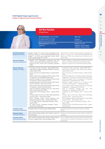 Riwayat PenunjukanAppointment History Diangkat sebagai VP Legal Counsel berdasarkan Surat Keputusan Direksi No. SKMJ-00113/K20000/2024-S8 tanggal 17 Juli 2024 yang menyatakan berlaku efektif terhitung sejak tanggal 16 Juli 2024.Appointed as VP Legal Counsel pursuant to Resolution of Board of Directors No. SKMJ-00113/K20000/2024-S8 dated July 17, 2024, which states that it is effective as of July 16, 2024.Riwayat PendidikanEducational Background%u2022 Magister (S2) International Corporate Law dari Erasmus Universiteit Rotterdam/Netherlands (2007).%u2022 Sarjana (S1) Ilmu Hukum dari Universitas Indonesia (1993).%u2022 Master's Degree in International Corporate Law from Erasmus Universiteit Rotterdam/Netherlands (2007).%u2022 Bachelor of Law (S1) from Universitas Indonesia (1993).Riwayat PekerjaanEmployment History%u2022 Consultant, Lexindo, Consulting - Jakarta (1998-2000)%u2022 Legal Advisor, Badan Penyehatan Perbankan Nasional, Jakarta (2000-2004)%u2022 Senior Associate, Ary Zulfikar & Partners, Jakarta (2004-2009)%u2022 Asisten Manajer Pgws Kepatuhan AP/JV, Kantor Pusat PT Pertamina - Dit. InvPlan&RM (2009-2010)%u2022 Assistant Manager Core SJV Compliance, Kantor Pusat PT Pertamina - Kantor Pusat (2011-2013)%u2022 Assistant Manager Contract & LA Finance & BD, Kantor Pusat PT Pertamina - Kantor Pusat (2013)%u2022 Senior Legal Counsel III Asset & Corp Mtrs, Kantor Pusat PT Pertamina - Kantor Pusat (2013-2015)%u2022 Legal & Compliance Manager, Drill. Serv. Area Kantor Pusat - Kantor Pusat (2015-2018)%u2022 Compliance & GCG Manager, Office - Jakarta (2018-2021)%u2022 Manager Legal Counsel Corp. Matters & BS, Subholding Upstream Office - Jakarta (2021-2022)%u2022 Senior Manager Legal Counsel Business Dev, Subholding Upstream Office - Jakarta (2022-2024)%u2022 Pj. VP Legal Counsel, Subholding Upstream Office - Jakarta (2024)%u2022 VP Legal Counsel, Subholding Upstream Office - Jakarta, (2024-sekarang) %u2022 Consultant, Lexindo, Consulting - Jakarta (1998-2000)%u2022 Legal Advisor, Indonesian Bank Restructuring Agency, Jakarta (2000-2004)%u2022 Senior Associate, Ary Zulfikar & Partners, Jakarta (2004-2009)%u2022 Assistant Manager AP/JV Compliance Pgws, PT Pertamina Headquarters - Directorate of InvPlan & RM (2009-2010)%u2022 Assistant Manager Core SJV Compliance, PT Pertamina Headquarters - Headquarters (2011-2013)%u2022 Assistant Manager Contract & LA Finance & BD, PT Pertamina Headquarters - Headquarters (2013)%u2022 Senior Legal Counsel III Asset & Corp Mtrs, PT Pertamina Headquarters - Headquarters (2013-2015)%u2022 Legal & Compliance Manager, Drill. Serv. Area Headquarters - Headquarters (2015-2018)%u2022 Compliance & GCG Manager, Office - Jakarta (2018-2021)%u2022 Manager Legal Counsel Corp. Matters & BS, Subholding Upstream Office - Jakarta (2021-2022)%u2022 Senior Manager Legal Counsel Business Dev, Subholding Upstream Office - Jakarta (2022-2024)%u2022 Pj. VP Legal Counsel, Subholding Upstream Office - Jakarta (2024)%u2022 VP Legal Counsel, Subholding Upstream Office - Jakarta, (2024-present)Sertifikasi ProfesiProfessional CertificationPendidikan Khusus Profesi Advokat, PERADI (2024) Special Education for Advocate Profession, PERADI (2024)Rangkap JabatanConcurrent PositionsTidak memiliki rangkap jabatan, baik di dalam maupun di luar Perusahaan.Holds no concurrent positions, either inside or outside the Company.Hubungan AfiliasiAffiliated RelationshipsTidak memiliki hubungan afiliasi dengan anggota Dewan Komisaris, anggota Direksi, atau pemegang saham.Has no affiliate relationship with members of the Board of Commissioners, members of the Board of Directors, or the shareholders.Siti Nur MaulinaVP Legal CounselPeriode Menjabat / Terms of Office Usia / AgeMenjabat sejak 16 Juli 2024Serving since July 16, 202450 tahun50 years oldKewarganegaraan / Citizenship Domisili / DomicileIndonesia Jagakarsa, South JakartaJagakarsa, Jakarta SelatanProfil Pejabat Fungsi Legal CounselProfile of Legal Counsel Function Officer 0102030405 Good Corporate Governance Tata kelola Perusahaan0607 PT Pertamina Hulu Energi 535