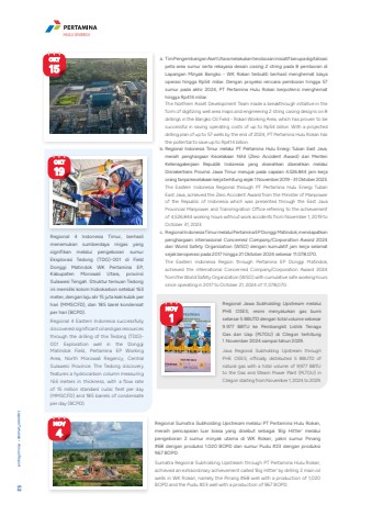 a. Tim Pengembangan Aset Utara melakukan terobosan inisiatif berupa digitalisasi peta area sumur serta rekayasa desain casing 2 string pada 8 pemboran di Lapangan Minyak Bangko - WK Rokan terbukti berhasil menghemat biaya operasi hingga Rp54 miliar. Dengan proyeksi rencana pemboran hingga 57 sumur pada akhir 2024, PT Pertamina Hulu Rokan berpotensi menghemat hingga Rp414 miliar.The Northern Asset Development Team made a breakthrough initiative in the form of digitizing well area maps and engineering 2 string casing designs on 8 drillings in the Bangko Oil Field - Rokan Working Area, which has proven to be successful in saving operating costs of up to Rp54 billion. With a projected drilling plan of up to 57 wells by the end of 2024, PT Pertamina Hulu Rokan has the potential to save up to Rp414 billion.b. Regional Indonesia Timur melalui PT Pertamina Hulu Energi Tuban East Java, meraih penghargaan Kecelakaan Nihil (Zero Accident Award) dari Menteri Ketenagakerjaan Republik Indonesia yang diserahkan diserahkan melalui Disnakertrans Provinsi Jawa Timur merujuk pada capaian 4.526.844 jam kerja orang tanpa kecelakaan kerja terhitung sejak 1 November 2019 - 31 Oktober 2023.The Eastern Indonesia Regional through PT Pertamina Hulu Energi Tuban East Java, achieved the Zero Accident Award from the Minister of Manpower of the Republic of Indonesia which was presented through the East Java Provincial Manpower and Transmigration Office referring to the achievement of 4,526,844 working hours without work accidents from November 1, 2019 to October 31, 2023.c. Regional Indonesia Timur melalui Pertamina EP Donggi Matindok, mendapatkan penghargaan internasional Concerned Company/Corporation Award 2024 dari World Safety Organization (WSO) dengan kumulatif jam kerja selamat sejak beroperasi pada 2017 hingga 21 Oktober 2024 sebesar 11.078.070.The Eastern Indonesia Region through Pertamina EP Donggi Matindok, achieved the international Concerned Company/Corporation Award 2024 from the World Safety Organization (WSO) with cumulative safe working hours since operating in 2017 to October 21, 2024 of 11,078,070.OKT15Regional Sumatra Subholding Upstream melalui PT Pertamina Hulu Rokan, meraih pencapaian luar biasa yang disebut sebagai 'Big Hitter' melalui pengeboran 2 sumur minyak utama di WK Rokan, yakni sumur Pinang #68 dengan produksi 1.020 BOPD dan sumur Pudu #23 dengan produksi 967 BOPD.Sumatra Regional Subholding Upstream through PT Pertamina Hulu Rokan, achieved an extraordinary achievement called 'Big Hitter' by drilling 2 main oil wells in WK Rokan, namely the Pinang #68 well with a production of 1,020 BOPD and the Pudu #23 well with a production of 967 BOPD.Regional 4 Indonesia Timur, berhasil menemukan sumberdaya migas yang signifikan melalui pengeboran sumur Eksplorasi Tedong (TDG)-001 di Field Donggi Matindok WK Pertamina EP, Kabupaten Morowali Utara, provinsi Sulawesi Tengah. Struktur temuan Tedong ini memiliki kolom hidrokarbon setebal 163 meter, dengan laju alir 15 juta kaki kubik per hari (MMSCFD), dan 185 barel kondensat per hari (BCPD).Regional 4 Eastern Indonesia successfully discovered significant oil and gas resources through the drilling of the Tedong (TDG)-001 Exploration well in the Donggi Matindok Field, Pertamina EP Working Area, North Morowali Regency, Central Sulawesi Province. The Tedong discovery features a hydrocarbon column measuring 163 meters in thickness, with a flow rate of 15 million standard cubic feet per day (MMSCFD) and 185 barrels of condensate per day (BCPD).OKT19NOV4Regional Jawa Subholding Upstream melalui PHE OSES, resmi menyalurkan gas bumi sebesar 5 BBUTD dengan total volume sebesar 9.977 BBTU ke Pembangkit Listrik Tenaga Gas dan Uap (PLTGU) di Cilegon terhitung 1 November 2024 sampai tahun 2029.Java Regional Subholding Upstream through PHE OSES, officially distributed 5 BBUTD of natural gas with a total volume of 9,977 BBTU to the Gas and Steam Power Plant (PLTGU) in Cilegon starting from November 1, 2024 to 2029.NOV1Laporan Tahunan %u2022 Annual Report 52PT Pertamina Hulu Energi 53HULU ENERGI