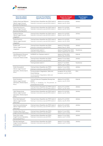Nama dan JabatanName and PositionJenis dan Tema PelatihanType & Theme of TrainingTempat dan TanggalPlace and DatePenyelenggaraOrganizerSulistyo Rachmad Wibowo(Senior Legal Counsel Business Development)Training Hukum Kepailitan dan PKPU batch 2Training in Insolvency Law and PKPU batch 2Jakarta, 25 Juli 2024Jakarta, July 25, 2024JenteraDimas Riyo Kusumo(Senior Legal Counsel Business Development)Training Hukum Kepailitan dan PKPU batch 2Training in Insolvency Law and PKPU batch 2Jakarta, 25 Juli 2024Jakarta, July 25, 2024JenteraArdhitya Rahman (Senior Legal Counsel Litigation)Training Hukum Kepailitan dan PKPU batch 2Training in Insolvency Law and PKPU batch 2Jakarta, 25 Juli 2024Jakarta, July 25, 2024JenteraDwika Pramono (Senior Legal Counsel Litigation)Training Hukum Kepailitan dan PKPU batch 2Training in Insolvency Law and PKPU batch 2Jakarta, 25 Juli 2024Jakarta, July 25, 2024JenteraMuslih Lutfi (Senior Legal Counsel Litigation)Training Hukum Kepailitan dan PKPUTraining in Insolvency Law and PKPUJakarta, 27 Mei 2024Jakarta, May 27, 2024JenteraTraining Aviator batch 4Training in Aviator batch 4Jakarta, 23 September 2024Jakarta, September 23, 2024TransformaVika Widyastuti Mumpuni(Senior Legal Counsel Corporate Matters & BS)SUPREME for Champion batch 2 Jakarta, 20 Mei 2024Jakarta, May, 20 2024InternalTraining Hukum Kepailitan dan PKPUTraining in Insolvency Law and PKPUJakarta, 13 Juni 2024Jakarta, June 13, 2024JenteraTraining Aviator batch 3 Jakarta, 17 Juli 2024Jakarta, July 17, 2024TransformaSisilia Srisuwastuti (Senior Legal Counsel Operation, Partnership & Proc.)Training Hukum Kepailitan dan PKPUTraining in Insolvency Law and PKPUJakarta, 13 Juni 2024Jakarta, June 13, 2024JenteraCommunication, Negotiation, Skills and Smart WorkingCommunication, Negotiation, Skills and Smart WorkingSurakarta, 26 Juni 2024Surakarta, June 26, 2024PCURizal Hendrarto (Senior Legal Counsel Operation, Partnership & Proc.)Training Pedoman Pengadaan Barang/Jasa A7001Training in Guidelines for Procurement of Goods/Services A7001Jakarta, 23 Juli 2024Jakarta, July 23, 2024InternalTraining Hukum Kepailitan dan PKPU batch 2Training in Insolvency Law and PKPU batch 2Jakarta, 25 Juli 2024Jakarta, July 25, 2024JenteraJefer Mangunsong(Senior Legal Counsel Operation, Partnership & Proc.)Training Hukum Kepailitan dan PKPU batch 2Training in Insolvency Law and PKPU batch 2Jakarta, 25 Juli 2024Jakarta, July 25, 2024JenteraDewi Adia Septiyanti(Senior Legal Counsel Advocacy)Training Hukum Kepailitan dan PKPU batch 2Training in Insolvency Law and PKPU batch 2Jakarta, 25 Juli 2024Jakarta, July 25, 2024JenteraIntan Kusuma Ambarsari(Senior Legal Counsel Advocacy)Training Hukum Kepailitan dan PKPU batch 2Training in Insolvency Law and PKPU batch 2Jakarta, 25 Juli 2024Jakarta, July 25, 2024JenteraPrasetyo Bayu Murty (Legal Counsel Advocacy)Training Hukum Kepailitan dan PKPUTraining in Insolvency Law and PKPUJakarta, 13 Juni 2024Jakarta, June 13, 2024JenteraDesty Dwi Lestari(Legal Counsel Operation, Partnership & Proc.)Training Hukum Kepailitan dan PKPU Training in Insolvency Law and PKPUJakarta, 13 Juni 2024Jakarta, June 13, 2024JenteraDita Eka Septiawati(Legal Counsel Business Development)Training Hukum Kepailitan dan PKPU Training in Insolvency Law and PKPUJakarta, 13 Juni 2024Jakarta, June 13, 2024Jentera Laporan Tahunan %u2022 Annual Report 538HULU ENERGI