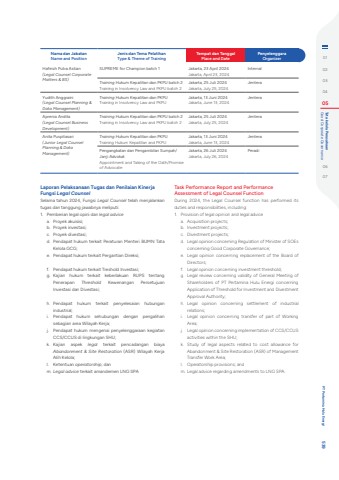 Nama dan JabatanName and PositionJenis dan Tema PelatihanType & Theme of TrainingTempat dan TanggalPlace and DatePenyelenggaraOrganizerHafeizh Putra Astian(Legal Counsel Corporate Matters & BS)SUPREME for Champion batch 1 Jakarta, 23 April 2024Jakarta, April 23, 2024InternalTraining Hukum Kepailitan dan PKPU batch 2Training in Insolvency Law and PKPU batch 2Jakarta, 25 Juli 2024Jakarta, July 25, 2024JenteraYudith Anggraini(Legal Counsel Planning & Data Management)Training Hukum Kepailitan dan PKPU Training in Insolvency Law and PKPUJakarta, 13 Juni 2024Jakarta, June 13, 2024JenteraAprenia Andita(Legal Counsel Business Development)Training Hukum Kepailitan dan PKPU batch 2Training in Insolvency Law and PKPU batch 2Jakarta, 25 Juli 2024Jakarta, July 25, 2024JenteraAnita Puspitasari (Junior Legal Counsel Planning & Data Management)Training Hukum Kepailitan dan PKPUTraining Hukum Kepailitan and PKPUJakarta, 13 Juni 2024Jakarta, June 13, 2024JenteraPengangkatan dan Pengambilan Sumpah/Janji AdvokatAppointment and Taking of the Oath/Promise of AdvocateJakarta, 26 Juli 2024Jakarta, July 26, 2024PeradiLaporan Pelaksanaan Tugas dan Penilaian Kinerja Fungsi Legal CounselSelama tahun 2024, Fungsi Legal Counsel telah menjalankan tugas dan tanggung jawabnya meliputi: 1. Pemberian legal opini dan legal advicea. Proyek akuisisi;b. Proyek investasi;c. Proyek divestasi;d. Pendapat hukum terkait Peraturan Menteri BUMN Tata Kelola GCG;e. Pendapat hukum terkait Pergantian Direksi;f. Pendapat hukum terkait Treshold Investasi;g. Kajian hukum terkait keberlakuan RUPS tentang Penerapan Threshold Kewenangan Persetujuan Investasi dan Divestasi;h. Pendapat hukum terkait penyelesaian hubungan industrial;i. Pendapat hukum sehubungan dengan pengalihan sebagian area Wilayah Kerja;j. Pendapat hukum mengenai penyelenggaraan kegiatan CCS/CCUS di lingkungan SHU;k. Kajian aspek legal terkait pencadangan biaya Abandonment & Site Restoration (ASR) Wilayah Kerja Alih Kelola; l. Ketentuan operatorship; danm. Legal advice terkait amandemen LNG SPATask Performance Report and Performance Assessment of Legal Counsel FunctionDuring 2024, the Legal Counsel function has performed its duties and responsibilities, including: 1. Provision of legal opinion and legal advicea. Acquisition projects;b. Investment projects;c. Divestment projects;d. Legal opinion concerning Regulation of Minister of SOEs concerning Good Corporate Governance;e. Legal opinion concerning replacement of the Board of Directors;f. Legal opinion concerning investment threshold;g. Legal review concerning validity of General Meeting of Shareholders of PT Pertamina Hulu Energi concerning Application of Threshold for Investment and Divestment Approval Authority;h. Legal opinion concerning settlement of industrial relations;i. Legal opinion concerning transfer of part of Working Area;j. Legal opinion concerning implementation of CCS/CCUS activities within the SHU;k. Study of legal aspects related to cost allowance for Abandonment & Site Restoration (ASR) of Management Transfer Work Area; l. Operatorship provisions; andm. Legal advice regarding amendments to LNG SPA. 0102030405 Good Corporate Governance Tata kelola Perusahaan0607 PT Pertamina Hulu Energi 539