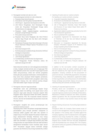 2. Penanganan kontrak rutin dan non rutinUntuk penanganan kontrak non-rutin, antara lain:a. Perjanjian Kerja Sama Korporasi.b. Amandemen dan Pernyataan Kembali KBH WK.c. LNG Project %u2013 Agreement dan Keyterms LNG SPA.d. JSA Potensi Pengelolaan, Aset Pembangkit Tenaga Listrik dan Penyediaan Pembangkit Tenaga Listrik Rendah Karbon di Lingkungan PHE.e. Perjanjian terkait kegiatan-kegiatan pendahuluan perjanjian-pengembangan CCS Hub.f. MoU potensi kerja sama EOR.g. Perjanjian Kerja Sama Pengkajian dan Studi Potensi Sumber Daya Minyak dan Gas Bumi serta Hidrogen Alami di Indonesia.h. Pembahasan Perjanjian Kerja Sama Dukungan Informasi Situasi Keamanan Wilayah Operasi Perusahaan di Luar Indonesia.i. MoU studi transport CCS.j. Kontrak perjanjian swakelola Study Generative Artificial Intellegence Exploration.k. Non Disclosure Agreement.l. Joint Study Agreement.m. Confidentiality and Restricted Use Agreement.n. MoU Penggunaan Produk Pertamina antara SH Upstream dengan SH C&T.Selain dokumen kontrak non-rutin sebagaimana disebutkan di atas, terdapat kontrak-kontrak rutin di lingkungan PHE yang dilakukan proses reviu-nya oleh Fungsi Legal Counseldalam penyusunannya, antara lain kontrak pengadaan barang dan jasa, perjanjian kerahasiaan, nota kesepahaman, kerja sama studi, perjanjian terkait kegiatan pendanaan, seperti pemberian fasilitas kredit, pengadaan valuta asing, pemberian treasury line, dan national pooling dengan bank-bank dalam negeri maupun luar negeri.3. Penanganan dokumen legal perusahaanMemberikan saran dan pertimbangan kepada fungsi pengguna dalam hal drafting, revisi aspek hukum untuk dokumen legal pada dokumen korporasi (seperti Akta Anggaran Dasar, Keputusan Direksi dan RUPS), dokumen terkait pedoman, TKO, TKI, Corporate Charter, Business Process, dan lain-lain berdasarkan key business issues dan key legal issues.4. Penanganan sengketa dan proses pendampingan dan pemberian bantuan hukum.Sepanjang tahun 2024, Perusahaan menghadapi beberapa permasalahan yang menjadi perhatian manajemen di antaranya adalah gugatan oleh salah satu operator di wilayah kerja di Australia kepada Perusahaan terkait klaim biaya abandonment terhadap Pertamina Hulu Energi Australia Pty Limited, Anak Perusahaan yang merupakan salah satu kontraktor di wilayah kerja tersebut yang telah mengundurkan diri sejak Oktober 2013 dan telah berstatus deregistered berdasarkan hukum Australia sejak Januari 2017. Perusahaan digugat karena bertindak sebagai guarantor dari Pertamina Hulu Energi Australia Pty Limited.2. Handling of routine and non-routine contractsFor handling non-routine contracts, including:a. Corporate Cooperation Agreement.b. Amendment and Restatement of KBH WK.c. LNG Project %u2013 Agreement and Key Terms of LNG SPA.d. JSA of Management Potentials, Power Plant Assets and Provision of Low Carbon Power Plants within PT Pertamina Hulu Energi.e. Agreements related to preliminary activities for the CCS Hub development agreement.f. MoU on potential EOR cooperation.g. Cooperation Agreement for Assessment and Study of Potentials of Oil and Gas and Natural Hydrogen Resources in Indonesia.h. Discussion on Cooperation Agreement for Security Situation Information Support of PT Pertamina Hulu Energi's Operating Area Outside Indonesia.i. MoU on CCS transport study.j. Self-managed agreement contract for Study Generative Artificial Intelligence Exploration.k. Non-Disclosure Agreement.l. Joint Study Agreement.m. Confidentiality and Restricted Use Agreement.n. MoU on Use of Pertamina Products between SH Upstream and SH C&T.In addition to the non-routine contract documents as mentioned above, there are routine contracts within PHE that are reviewed by the Legal Counsel Function in their preparation, including contracts for the procurement of goods and services, confidentiality agreements, memoranda of understanding, study collaborations, agreements related to financing activities, such as the provision of credit facilities, foreign exchange procurement, treasury line provision, and national pooling with domestic and foreign banks.3. Handling of corporate legal documentsProviding advice and consideration to user functions in terms of drafting and revising the legal aspects of corporate legal documents (such as Articles of Association, Resolutions of Board of Directors and GMS), documents related to guidelines, TKO, TKI, Corporate Charter, Business Process, etc. based on key business issues and key legal issues.4. Dispute handling and process of providing legal assistance and aid.Throughout 2024, the Company faced several issues of concern to the management, including a lawsuit by one of the operators in the working area in Australia against the Company regarding a claim for abandonment costs against Pertamina Hulu Energi Australia Pty Limited, a Subsidiary which is one of the contractors in the working area who has resigned since October 2013 and has been deregistered under the Australian law since January 2017. The Company was sued for acting as a guarantor of Pertamina Hulu Energi Australia Pty Limited.Laporan Tahunan %u2022 Annual Report 540HULU ENERGI