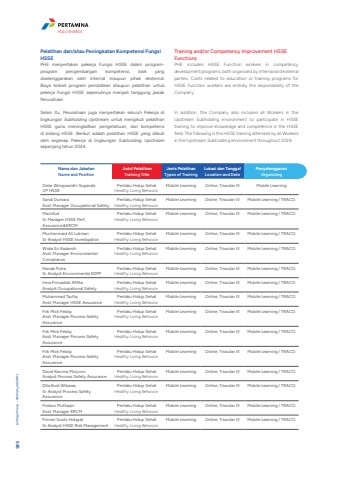 Pelatihan dan/atau Peningkatan Kompetensi Fungsi HSSEPHE menyertakan pekerja Fungsi HSSE dalam programprogram pengembangan kompetensi, baik yang diselenggarakan oleh internal maupun pihak eksternal. Biaya terkait program pendidikan ataupun pelatihan untuk pekerja Fungsi HSSE sepenuhnya menjadi tanggung jawab Perusahaan.Selain itu, Perusahaan juga menyertakan seluruh Pekerja di lingkungan Subholding Upstream untuk mengikuti pelatihan HSSE guna meningkatkan pengetahuan, dan kompetensi di bidang HSSE. Berikut adalah pelatihan HSSE yang diikuti oleh segenap Pekerja di lingkungan Subholding Upstreamsepanjang tahun 2024. Training and/or Competency Improvement HSSE FunctionsPHE includes HSSE Function workers in competency development programs, both organized by internal and external parties. Costs related to education or training programs for HSSE Function workers are entirely the responsibility of the Company.In addition, the Company also includes all Workers in the Upstream Subholding environment to participate in HSSE training to improve knowledge and competence in the HSSE field. The following is the HSSE training attended by all Workers in the Upstream Subholding environment throughout 2024.Nama dan JabatanName and PositionJudul PelatihanTraining TitleJenis PelatihanTypes of TrainingLokasi dan TanggalLocation and DatePenyelenggaranOrganizingGelar Winayawidhi SugandaVP HSSEPerilaku Hidup SehatHealthy Living BehaviorMobile Learning Online, Triwulan III Mobile LearningSandi DumaraAsst. Manager Occupational SafetyPerilaku Hidup SehatHealthy Living BehaviorMobile Learning Online, Triwulan IV Mobile Learning / TRACOMachfudSr Manager HSSE Perf, Assurance,&ERCMPerilaku Hidup SehatHealthy Living BehaviorMobile Learning Online, Triwulan III Mobile Learning / TRACOMuchammad Ali LukmanSr Analyst HSSE InvestigationPerilaku Hidup SehatHealthy Living BehaviorMobile Learning Online, Triwulan III Mobile Learning / TRACOWidia Sri KadarsihAsst. Manager Environmental CompliancePerilaku Hidup SehatHealthy Living BehaviorMobile Learning Online, Triwulan III Mobile Learning / TRACONanda PutraSr Analyst Environmental EDPPPerilaku Hidup SehatHealthy Living BehaviorMobile Learning Online, Triwulan III Mobile Learning / TRACOIrma Primadiati AfifkaAnalyst Occupational SafetyPerilaku Hidup SehatHealthy Living BehaviorMobile Learning Online, Triwulan III Mobile Learning / TRACOMuhammad TaufiqAsst. Manager HSSE AssurancePerilaku Hidup SehatHealthy Living BehaviorMobile Learning Online, Triwulan III Mobile Learning / TRACOFrik Mick FebbyAsst. Manager Process Safety AssurancePerilaku Hidup SehatHealthy Living BehaviorMobile Learning Online, Triwulan III Mobile Learning / TRACOFrik Mick FebbyAsst. Manager Process Safety AssurancePerilaku Hidup SehatHealthy Living BehaviorMobile Learning Online, Triwulan III Mobile Learning / TRACOFrik Mick FebbyAsst. Manager Process Safety AssurancePerilaku Hidup SehatHealthy Living BehaviorMobile Learning Online, Triwulan III Mobile Learning / TRACODavid Karunia MulyonoAnalyst Process Safety AssurancePerilaku Hidup SehatHealthy Living BehaviorMobile Learning Online, Triwulan III Mobile Learning / TRACODita Budi WibawaSr Analyst Process Safety AssurancePerilaku Hidup SehatHealthy Living BehaviorMobile Learning Online, Triwulan III Mobile Learning / TRACOFirdaus MuttaqinAsst. Manager ERCMPerilaku Hidup SehatHealthy Living BehaviorMobile Learning Online, Triwulan III Mobile Learning / TRACOFirman Susilo HidayatSr Analyst HSSE Risk ManagementPerilaku Hidup SehatHealthy Living BehaviorMobile Learning Online, Triwulan III Mobile Learning / TRACOLaporan Tahunan %u2022 Annual Report 546HULU ENERGI