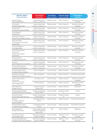 Nama dan JabatanName and PositionJudul PelatihanTraining TitleJenis PelatihanTypes of TrainingLokasi dan TanggalLocation and DatePenyelenggaranOrganizingFirdaus MuttaqinAsst. Manager ERCMPerilaku Hidup SehatHealthy Living BehaviorMobile Learning Online, Triwulan III Pertamina Corporate UniversityDeni FahrizalSr Analyst Safety EDPPPerilaku Hidup SehatHealthy Living BehaviorMobile Learning Online, Triwulan III Pertamina Corporate UniversitySyamsul ArifinSr Analyst Occupational SafetyPerilaku Hidup SehatHealthy Living BehaviorMobile Learning Online, Triwulan III Pertamina Corporate UniversityErlina WiraswatiAnalyst ERCMPerilaku Hidup SehatHealthy Living BehaviorMobile Learning Online, Triwulan III Pertamina Corporate UniversityDavid Karunia MulyonoAnalyst Process Safety AssurancePerilaku Hidup SehatHealthy Living BehaviorMobile Learning Online, Triwulan III Pertamina Corporate UniversityWahyu Dwi AstutiAsst. Manager Environmental SustainabilityPerilaku Hidup SehatHealthy Living BehaviorMobile Learning Online, Triwulan III Pertamina Corporate UniversityPutu Surya WibisanaSr Manager SafetyPerilaku Hidup SehatHealthy Living BehaviorMobile Learning Online, Triwulan III Pertamina Corporate UniversityIndachi Purada Maulina SimanjuntakAnalyst Environmental SustainabiltyPerilaku Hidup SehatHealthy Living BehaviorMobile Learning Online, Triwulan III Pertamina Corporate UniversityM Agung WibowoSr Analyst Security EDPPPerilaku Hidup SehatHealthy Living BehaviorMobile Learning Online, Triwulan III Pertamina Corporate UniversitySuwasonoAsst. Manager Security OperationsPerilaku Hidup SehatHealthy Living BehaviorMobile Learning Online, Triwulan III Pertamina Corporate UniversityMohammad FatkhanudinSr Analyst Security PhysicalPerilaku Hidup SehatHealthy Living BehaviorMobile Learning Online, Triwulan III Pertamina Corporate UniversityMuchammad Ali LukmanSr Analyst HSSE InvestigationBasic Investigation Inhouse Training Jakarta, Triwulan IV HC Pertamina Hulu EnergiDavid Karunia MulyonoAnalyst Process Safety AssuranceBasic Investigation Inhouse Training Jakarta, Triwulan IV HC Pertamina Hulu EnergiIndachi Purada Maulina SimanjuntakAhmad Soim MunawarAsst. Manager OHIHFirst Aider Level 2 Inhouse Training Jakarta, Triwulan II Pertamina Corporate UniversityHSSE Leadership Inhouse Training Jakarta, Triwulan III Pertamina Corporate UniversitySatrio WyardionoManager SecurityIncident Command System (ICS)Inhouse Training Jakarta, Triwulan III HSSE Reg 2Danang Agung WikantadhiSr Analyst HSSE Audit & InspectionInspeksi Housekeeping & Safety BarrierInhouse Training Sumatera, Triwulan IIIInternalMuhammad TaufiqAsst. Manager HSSE AssuranceInspeksi Housekeeping & Safety BarrierInhouse Training Sumatera, Triwulan IIIInternalMachfudSr Manager HSSE Perf, Assurance,&ERCMInvestigating Human FactorsInhouse Training Jakarta, Triwulan III Human Factor IndonesiaMuchammad Ali LukmanSr Analyst HSSE InvestigationInvestigating Human FactorsInhouse Training Jakarta, Triwulan III Human Factor IndonesiaRotua Elyzabeth NManager EnvironmentProcess Safety & Asset Integrity Management System (CBT)CBT Online, Triwulan I Regional 3Ahmad Soim MunawarAsst. Manager OHIHRefreshment Pelatihan Auditor SUPREMEInhouse Training Jakarta, 9 - 12 Juli 2024Pertamina Corporate UniversityDanang Agung WikantadhiSr Analyst HSSE Audit & InspectionRefreshment Pelatihan Auditor SUPREMEInhouse Training Jakarta, 9 - 12 Juli 2024Pertamina Corporate University0102030405 Good Corporate Governance Tata kelola Perusahaan0607 PT Pertamina Hulu Energi 549