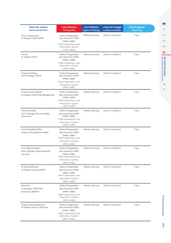 Nama dan JabatanName and PositionJudul PelatihanTraining TitleJenis PelatihanTypes of TrainingLokasi dan TanggalLocation and DatePenyelenggaranOrganizingErwin TampubolonSr Analyst Health EDPPSistem Pengamatan dan Intervensi HSSE (PEKA / BBS)HSSE Observation and Intervention System (PEKA / BBS)Mobile Learning Online, Triwulan III TracoFarrahSr Analyst OHIHSistem Pengamatan dan Intervensi HSSE (PEKA / BBS)HSSE Observation and Intervention System (PEKA / BBS)Mobile Learning Online, Triwulan III TracoFirdaus MuttaqinAsst. Manager ERCMSistem Pengamatan dan Intervensi HSSE (PEKA / BBS)HSSE Observation and Intervention System (PEKA / BBS)Mobile Learning Online, Triwulan III TracoFirman Susilo HidayatSr Analyst HSSE Risk ManagementSistem Pengamatan dan Intervensi HSSE (PEKA / BBS)HSSE Observation and Intervention System (PEKA / BBS)Mobile Learning Online, Triwulan III TracoFrik Mick FebbyAsst. Manager Process Safety AssuranceSistem Pengamatan dan Intervensi HSSE (PEKA / BBS)HSSE Observation and Intervention System (PEKA / BBS)Mobile Learning Online, Triwulan III TracoIrma Primadiati AfifkaAnalyst Occupational SafetySistem Pengamatan dan Intervensi HSSE (PEKA / BBS)HSSE Observation and Intervention System (PEKA / BBS)Mobile Learning Online, Triwulan III TracoLulus WijiyuswardiniAsst. Manager Medical Benefit ServicesSistem Pengamatan dan Intervensi HSSE (PEKA / BBS)HSSE Observation and Intervention System (PEKA / BBS)Mobile Learning Online, Triwulan III TracoM Agung WibowoSr Analyst Security EDPPSistem Pengamatan dan Intervensi HSSE (PEKA / BBS)HSSE Observation and Intervention System (PEKA / BBS)Mobile Learning Online, Triwulan III TracoMachfudSr Manager HSSE Perf, Assurance,&ERCMSistem Pengamatan dan Intervensi HSSE (PEKA / BBS)HSSE Observation and Intervention System (PEKA / BBS)Mobile Learning Online, Triwulan III TracoMohammad FatkhanudinSr Analyst Security PhysicalSistem Pengamatan dan Intervensi HSSE (PEKA / BBS)HSSE Observation and Intervention System (PEKA / BBS)Mobile Learning Online, Triwulan III Traco0102030405 Good Corporate Governance Tata kelola Perusahaan0607 PT Pertamina Hulu Energi 551