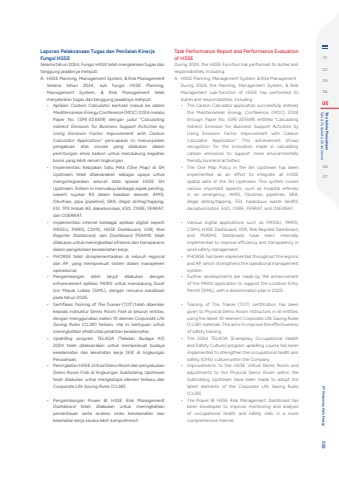 Laporan Pelaksanaan Tugas dan Penilaian Kinerja Fungsi HSSESelama tahun 2024, Fungsi HSSE telah menjalankan tugas dan tanggung jawabnya meliputi: A. HSSE Planning, Management System, & Risk ManagementSelama tahun 2024, sub fungsi HSSE Planning, Management System, & Risk Management telah menjalankan tugas dan tanggung jawabnya meliputi:%u2022 Aplikasi Carbon Calculator berhasil masuk ke dalam Mediterranean Energy Conference (MOC) 2024 melalui Paper No. (SPE-223339) dengan judul \Indirect Emission for Business Support Activities by Using Emission Factor Improvement with Carbon Calculator Application.\pengakuan atas inovasi yang dilakukan dalam perhitungan emisi karbon untuk mendukung kegiatan bisnis yang lebih ramah lingkungan.%u2022 Implementasi Kebijakan Satu Peta (One Map) di SH Upstream telah dilaksanakan sebagai upaya untuk mengintegrasikan seluruh data spasial HSSE SH Upstream. Sistem ini mencakup berbagai aspek penting, seperti rujukan RS dalam keadaan darurat, AMIS, Obvitnas, pipa (pipeline), SRA, illegal drilling/tapping, ESI, TPS limbah B3, dekarbonisasi, ESG, OSRE, FERRAT, dan OSERRAT.%u2022 Implementasi internal berbagai aplikasi digital seperti IMISSU, PARIS, CSMS, HSSE Dashboard, VDR, Risk Register Dashboard, dan Dashboard PSAIMS telah dilakukan untuk meningkatkan efisiensi dan transparansi dalam pengelolaan keselamatan kerja.%u2022 PHORSE telah diimplementasikan di seluruh regional dan AP, yang memperkuat sistem dalam manajemen operasional.%u2022 Pengembangan lebih lanjut dilakukan dengan enhancement aplikasi PARIS untuk mendukung Surat Izin Masuk Lokasi (SIML), dengan rencana sosialisasi pada tahun 2025.%u2022 Sertifikasi Training of The Trainer (TOT) telah diberikan kepada instruktur Demo Room Fisik di seluruh entitas, dengan menggunakan materi 10 elemen Corporate Life Saving Rules (CLSR) terbaru. Hal ini bertujuan untuk meningkatkan efektivitas pelatihan keselamatan.%u2022 Upskilling program TELAGA (Teladan Budaya K3) 2024 telah dilaksanakan untuk memperkuat budaya keselamatan dan kesehatan kerja (K3) di lingkungan Perusahaan.%u2022 Peningkatan HSSE Virtual Demo Room dan penyesuaian Demo Room Fisik di lingkungan Subholding Upstreamtelah dilakukan untuk mengadopsi elemen terbaru dari Corporate Life Saving Rules (CLSR).%u2022 Pengembangan Power BI HSSE Risk Management Dashboard telah dilakukan untuk meningkatkan pemantauan serta analisis risiko keselamatan dan kesehatan kerja secara lebih komprehensif.Task Performance Report and Performance Evaluation of HSSEDuring 2024, the HSSE Function has performed its duties and responsibilities, including:A. HSSE Planning, Management System, & Risk Management During 2024, the Planning, Management System, & Risk Management sub-function of HSSE has performed its duties and responsibilities, including:%u2022 The Carbon Calculator application successfully entered the Mediterranean Energy Conference (MOC) 2024 through Paper No. (SPE-223339) entitled %u201cCalculating Indirect Emission for Business Support Activities by Using Emission Factor Improvement with Carbon Calculator Application.%u201d This achievement shows recognition for the innovation made in calculating carbon emissions to support more environmentally friendly business activities.%u2022 The One Map Policy in the SH Upstream has been implemented as an effort to integrate all HSSE spatial data of the SH Upstream. This system covers various important aspects, such as hospital referrals in an emergency, AMIS, Obvitnas, pipelines, SRA, illegal drilling/tapping, ESI, hazardous waste landfill, decarbonization, ESG, OSRE, FERRAT, and OSERRAT.%u2022 Various digital applications such as IMISSU, PARIS, CSMS, HSSE Dashboard, VDR, Risk Register Dashboard, and PSAIMS Dashboard have been internally implemented to improve efficiency and transparency in work safety management.%u2022 PHORSE has been implemented throughout the regions and AP, which strengthens the operational management system.%u2022 Further developments are made by the enhancement of the PARIS application to support the Location Entry Permit (SIML), with a dissemination plan in 2025.%u2022 Training of The Trainer (TOT) certification has been given to Physical Demo Room instructors in all entities, using the latest 10-element Corporate Life Saving Rules (CLSR) materials. This aims to improve the effectiveness of safety training.%u2022 The 2024 TELAGA (Exemplary Occupational Health and Safety Culture) program upskilling course has been implemented to strengthen the occupational health and safety (OHS) culture within the Company.%u2022 Improvements to the HSSE Virtual Demo Room and adjustments to the Physical Demo Room within the Subholding Upstream have been made to adopt the latest elements of the Corporate Life Saving Rules (CLSR).%u2022 The Power BI HSSE Risk Management Dashboard has been developed to improve monitoring and analysis of occupational health and safety risks in a more comprehensive manner.0102030405 Good Corporate Governance Tata kelola Perusahaan0607 PT Pertamina Hulu Energi 555