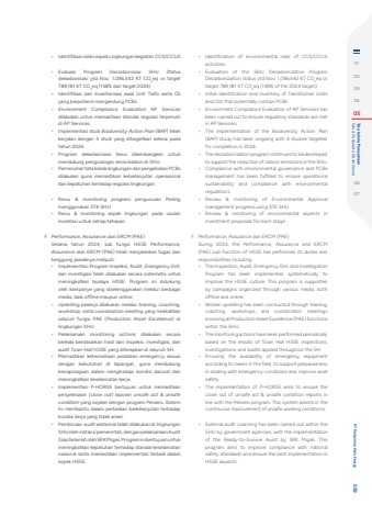 %u2022 Identifikasi risiko aspek Lingkungan kegiatan CCS/CCUS%u2022 Evaluasi Program Decarbonisasi SHU Status dekarbonisasi ytd Nov: 1.096,542 KT CO2eq vs target 789,181 KT CO2eq (138% dari target 2024)%u2022 Identifikasi dan Inventarisasi awal Unit Trafo serta Oli yang berpotensi mengandung PCBs%u2022 Environment Compliance Evaluation AP Services dilakukan untuk memastikan standar regulasi terpenuhi di AP Services.%u2022 Implementasi studi Biodiversity Action Plan (BAP) telah berjalan dengan 4 studi yang ditargetkan selesai pada tahun 2024.%u2022 Program dekarbonisasi terus dikembangkan untuk mendukung pengurangan emisi karbon di SHU.%u2022 Pemenuhan tata kelola lingkungan dan pengelolaan PCBs dilakukan guna memastikan keberlanjutan operasional dan kepatuhan terhadap regulasi lingkungan.%u2022 Reviu & monitoring progress pengurusan Perling menggunakan STK SHU%u2022 Reviu & monitoring aspek lingkungan pada usulan investasi untuk setiap tahapanF. Performance, Assurance dan ERCM (PAE)Selama tahun 2024, sub fungsi HSSE Performance, Assurance dan ERCM (PAE) telah menjalankan tugas dan tanggung jawabnya meliputi:%u2022 Implementasi Program Inspeksi, Audit, Emergency Drill, dan Investigasi telah dilakukan secara sistematis untuk meningkatkan budaya HSSE. Program ini didukung oleh kampanye yang diselenggarakan melalui berbagai media, baik offline maupun online.%u2022 Upskilling pekerja dilakukan melalui training, coaching, workshop, serta coordination meeting yang melibatkan seluruh fungsi PAE (Production Asset Excellence) di lingkungan SHU.%u2022 Pelaksanaan monitoring actions dilakukan secara berkala berdasarkan hasil dari inspeksi, investigasi, dan audit Town Hall HSSE yang diterapkan di seluruh SH.%u2022 Memastikan ketersediaan peralatan emergency sesuai dengan kebutuhan di lapangan, guna mendukung kesiapsiagaan dalam menghadapi kondisi darurat dan meningkatkan keselamatan kerja.%u2022 Implementasi P-HORSE bertujuan untuk memastikan penyelesaian (close out) laporan unsafe act & unsafe condition yang sejalan dengan program Persero. Sistem ini membantu dalam perbaikan berkelanjutan terhadap kondisi kerja yang tidak aman.%u2022 Pembinaan audit eksternal telah dilakukan di lingkungan SHU oleh instansi pemerintah, dengan pelaksanaan Audit Siap Selamat oleh SKK Migas. Program ini bertujuan untuk meningkatkan kepatuhan terhadap standar keselamatan nasional serta memastikan implementasi terbaik dalam aspek HSSE.%u2022 Identification of environmental risks of CCS/CCUS activities%u2022 Evaluation of the SHU Decarbonization Program Decarbonization status ytd Nov: 1,096,542 KT CO2eq vs target 789,181 KT CO2eq (138% of the 2024 target)%u2022 Initial identification and inventory of Transformer Units and Oils that potentially contain PCBs%u2022 Environment Compliance Evaluation of AP Services has been carried out to ensure regulatory standards are met in AP Services.%u2022 The implementation of the Biodiversity Action Plan (BAP) study has been ongoing with 4 studies targeted for completion in 2024.%u2022 The decarbonization program continues to be developed to support the reduction of carbon emissions in the SHU.%u2022 Compliance with environmental governance and PCBs management has been fulfilled to ensure operational sustainability and compliance with environmental regulations.%u2022 Review & monitoring of Environmental Approval management progress using STK SHU%u2022 Review & monitoring of environmental aspects in investment proposals for each stageF. Performance, Assurance dan ERCM (PAE)During 2024, the Performance, Assurance and ERCM (PAE) sub-function of HSSE has performed its duties and responsibilities including:%u2022 The Inspection, Audit, Emergency Drill, and Investigation Program has been implemented systematically to improve the HSSE culture. This program is supported by campaigns organized through various media, both offline and online.%u2022 Worker upskilling has been conducted through training, coaching, workshops, and coordination meetings involving all Production Asset Excellence (PAE) functions within the SHU.%u2022 The monitoring actions have been performed periodically based on the results of Town Hall HSSE inspections, investigations, and audits applied throughout the SH.%u2022 Ensuring the availability of emergency equipment according to needs in the field, to support preparedness in dealing with emergency conditions and improve work safety.%u2022 The implementation of P-HORSE aims to ensure the close out of unsafe act & unsafe condition reports in line with the Persero program. This system assists in the continuous improvement of unsafe working conditions.%u2022 External audit coaching has been carried out within the SHU by government agencies, with the implementation of the Ready-to-Survive Audit by SKK Migas. This program aims to improve compliance with national safety standards and ensure the best implementation in HSSE aspects.0102030405 Good Corporate Governance Tata kelola Perusahaan0607 PT Pertamina Hulu Energi 559