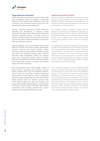 Fungsi Upstream InnovationDireksi membentuk Fungsi Upstream Innovation dalam rangka untuk menghadirkan Center of Excellence di Subholding Upstream. Seluruh program yang dilaksanakan oleh Fungsi UI ditujukan untuk mendukung Pertamina Group, PHE, dan seluruh Anak Perusahaan secara berkelanjutan.Upstream Innovation berkontribusi bersama Exploration Technology dan Development & Production dengan memberikan technology solution dalam operasional khususnya lingkungan Subholding Upstream. Technology solution ini meliputi consultation problem solving dan technical advisory yang ditujukan dalam mengatasi permasalahan operasional di lingkungan Subholding Upstream.Dalam meningkatkan value dan portofolio Perusahaan, Fungsi Upstream Innovation juga berperan dalam pengembangan portofolio manajemen dan inkubasi teknologi. Inkubasi teknologi memiliki peran penting dalam menciptakan teknologi yang efisien dan terupdate sehingga dapat membantu Perusahaan dalam meningkatkan produksi dan cadangan migas. Untuk memperkaya portofolio dalam hal inkubasi teknologi, Fungsi Upstream Innovation melakukan study/pilot project yang bersifat strategic di antaranya yang berkaitan dengan Low Carbon Technology. Hal ini dikontribusikan melalui Study Strategic Initiatives & Study Innovation Technology, serta pemberian Technical Advisory kepada regional dan zona Subholding Upstream. Fungsi UI juga terus membangun Capability Developmentbagi Pertamina dan PHE. Selain itu, Fungsi UI memberikan dukungan terhadap digitalisasi teknologi yang dikontribusikan melalui Upstream Cloud dan Pertamina Upstream Data Center (PUDC) sebagai pusat data yang terintegrasi, dan Fungsi UI telah memiliki beberapa kategori License Softwaredi antaranya; Software Surface, Subsurface, Well Integrity, Geomechanic untuk menunjang pekerjaan baik di internal Fungsi maupun di Fungsi UBD, Eksplorasi, dan D&P. Upstream Innovation FunctionThe Board of Directors established the Upstream Innovation Function in order to establish a Center of Excellence in the Subholding Upstream. All programs implemented by the UI Function are aimed at supporting Pertamina Group, PHE, and all Subsidiaries on an sustainable basis. The Upstream Innovation contributes together with the Exploration Technology and Development & Production by providing technology solutions in operations, especially within the Subholding Upstream. These technology solutions include problem solving consultation and technical advisory aimed at overcoming operational problems within the Subholding Upstream. In increasing the Company's value and portfolio, the Upstream Innovation Function also plays a role in the development of the technology management and incubation portfolio. Technology incubation plays an important role in creating efficient and updated technology so as to help the Company increase production and oil and gas reserves. To enrich the portfolio in terms of technology incubation, the Upstream Innovation Function conducts strategic study/pilot projects, including those related to Low Carbon Technology. This is contributed through the Study of Strategic Initiatives & Study of Innovation Technology, as well as the provision of Technical Advisory to regions and zones of the Subholding Upstream. The UI Function also continues to build Capability Development for Pertamina and PHE. In addition, the UI Function provides support for the digitalization of technology contributed through Upstream Cloud and Pertamina Upstream Data Center (PUDC) as an integrated data center. And the UI Function already has several License Software categories including; Surface Software, Subsurface, Well Integrity, Geomechanic to support work both internally in the Function and in the UBD, Exploration, and D&P Function. Laporan Tahunan %u2022 Annual Report 560HULU ENERGI