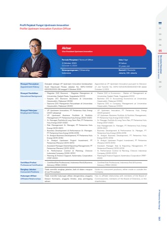 Riwayat Penunjukan Appointment History Diangkat sebagai VP Upstream Innovation berdasarkan Surat Keputusan Mutasi Jabatan No. SKMJ-00122/K20000/2023-S8 tanggal 3 Oktober 2023.Appointed as VP Upstream Innovation pursuant to Decision of Job Transfer No. SKMJ-00122/K20000/2023-S8 dated October 3, 2023.Riwayat PendidikanEducational Background%u2022 Magister (S2) Ekonomi - Magister Manajemen di Universitas Gadjah Mada, Yogyakarta (2010)%u2022 Sarjana (S1) Ekonomi Akuntansi di Universitas Hasanuddin, Makassar (2006)%u2022 Diploma (D3) Manajemen Perusahaan di Universitas Hasanuddin, Makassar (2000)%u2022 Master (S2) in Economics - Master of Management at Universitas Gadjah Mada, Yogyakarta (2010)%u2022 Bachelor (S1) in Accounting Economics at Universitas Hasanuddin, Makassar (2006)%u2022 Diploma (D3) in Company Management at Universitas Hasanuddin, Makassar (2000)Riwayat PekerjaanEmployment History%u2022 VP Upstream Innovation, PT Pertamina Hulu Energi (2023-sekarang)%u2022 VP Upstream Business Portfolio & Portfolio Management, PT Pertamina Hulu Energi (2022-2023)%u2022 Sr. Manager Portfolio & Long Term Plan, PT Pertamina Hulu Energi (2021-2022)%u2022 Risk Management Sr. Manager, PT Pertamina Hulu Energi (2019-2021)%u2022 Business Development & Performance Sr. Manager, PT Pertamina Hulu Energi (2016-2019)%u2022 Sr. Analyst Business Development, PT Pertamina Hulu Energi (2015-2016)%u2022 Sr. Analyst Upstream Project Investment, PT Pertamina (Persero) (2013-2015)%u2022 Assistant Manager Stat & Reporting Management, PT Pertamina (Persero) (2010-2013)%u2022 Sr. Performance Control & Planning, Chevron Indonesia Company (2000-2010)%u2022 Planning & Finance Support, Kanematzu Corporation (1997-2000)%u2022 VP Upstream Innovation, PT Pertamina Hulu Energi (2023-present)%u2022 VP Upstream Business Portfolio & Portfolio Management, PT Pertamina Hulu Energi (2022-2023)%u2022 Sr. Manager Portfolio & Long-Term Plan, PT Pertamina Hulu Energi (2021-2022)%u2022 Risk Management Sr. Manager, PT Pertamina Hulu Energi (2019-2021)%u2022 Business Development & Performance Sr. Manager, PT Pertamina Hulu Energi (2016-2019)%u2022 Sr. Analyst Business Development, PT Pertamina Hulu Energi (2015-2016)%u2022 Sr. Analyst Upstream Project Investment, PT Pertamina (Persero) (2013-2015)%u2022 Assistant Manager Stat & Reporting Management, PT Pertamina (Persero) (2010-2013)%u2022 Sr. Performance Control & Planning, Chevron Indonesia Company (2000-2010)%u2022 Planning & Finance Support, Kanematzu Corporation (1997-2000)Sertifikasi ProfesiProfessional Certification%u2022 Certified Risk Professional, Indonesia Risk & Business Advisory (IRBA) (2024)%u2022 Certified Risk Professional, Indonesia Risk & Business Advisory (IRBA) (2024)Rangkap JabatanConcurrent PositionsTidak memiliki rangkap jabatan, baik di dalam maupun di luar Perusahaan.Holds no concurrent positions, either inside or outside the Company.Hubungan AfiliasiAffiliated RelationshipsTidak memiliki hubungan afiliasi dengan/atau anggota Dewan Komisaris, anggota Direksi, atau pemegang saham.Has no affiliate relationship with members of the Board of Commissioners, members of the Board of Directors, or the shareholders.AkbarVice President Upstream InnovationPeriode Menjabat / Terms of Office Usia / Age3 Oktober 2023October 3, 202351 tahun51 years oldKewarganegaraan / Citizenship Domisili / DomicileIndonesia Jakarta, DKI JakartaProfil Pejabat Fungsi Upstream InnovationProfile Upstream Innovation Function Officer 0102030405 Good Corporate Governance Tata kelola Perusahaan0607 PT Pertamina Hulu Energi 561
