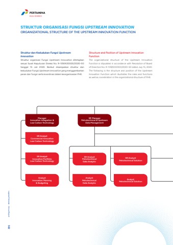 STRUKTUR ORGANISASI FUNGSI UPSTREAM INNOVATIONORGANIZATIONAL STRUCTURE OF THE UPSTREAM INNOVATION FUNCTIONStruktur dan Kedudukan Fungsi Upstream InnovationStruktur organisasi Fungsi Upstream Innovation ditetapkan sesuai Surat Keputusan Direksi No. R-109/K00000/2020-S0 tanggal 15 Juli 2020. Berikut disampaikan struktur dan kedudukan Fungsi Upstream innovation yang menggambarkan peran dan fungsi serta koordinasi dalam keorganisasian PHE.Structure and Position of Upstream Innovation FunctionThe organizational structure of the Upstream Innovation Function is stipulated in accordance with Resolution of Board of Directors No. R-109/K00000/2020-S0 dated July 15, 2020. The following is the structure and position of the Upstream Innovation Function which illustrates the roles and functions as well as coordination in the organizational structure of PHE.AnalystPetrotechnical SolutionAnalyst Petrotechnical Data AnalyticAnalystInnovation Planning & BudgetingSR Analyst Innovation PortfolioLow Carbon TechnologySR Analyst PetrotechnicalData AnalyticSR AnalystPetrotechnical SolutionSR Analyst Commercial Innovation Low Carbon TechnologyManager Innovation Integration & Low Carbon TechnologySR Manager Petrotechnical & Upstream Data ManagementLaporan Tahunan %u2022 Annual Report 562HULU ENERGI