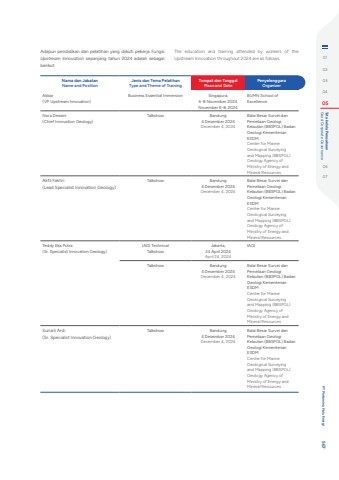 Adapun pendidikan dan pelatihan yang diikuti pekerja Fungsi Upstream Innovation sepanjang tahun 2024 adalah sebagai berikut.Nama dan JabatanName and PositionJenis dan Tema PelatihanType and Theme of TrainingTempat dan TanggalPlace and DatePenyelenggaraOrganizerAkbar(VP Upstream Innovation)Business Essential Immersion Singapura,6-8 November 2024November 6-8, 2024BUMN School of ExcellenceNora Desiani(Chief Innovation Geology)Talkshow Bandung4 Desember 2024December 4, 2024Balai Besar Survei dan Pemetaan Geologi Kelautan (BBSPGL) Badan Geologi Kementerian ESDMCenter for Marine Geological Surveying and Mapping (BBSPGL) Geology Agency of Ministry of Energy and Mineral ResourcesAkfil Fakhri(Lead Specialist Innovation Geology)Talkshow Bandung4 Desember 2024December 4, 2024Balai Besar Survei dan Pemetaan Geologi Kelautan (BBSPGL) Badan Geologi Kementerian ESDMCenter for Marine Geological Surveying and Mapping (BBSPGL) Geology Agency of Ministry of Energy and Mineral ResourcesTeddy Eka Putra(Sr. Specialist Innovation Geology)IAGI TechnicalTalkshowJakarta,24 April 2024April 24, 2024IAGITalkshow Bandung4 Desember 2024December 4, 2024Balai Besar Survei dan Pemetaan Geologi Kelautan (BBSPGL) Badan Geologi Kementerian ESDMCenter for Marine Geological Surveying and Mapping (BBSPGL) Geology Agency of Ministry of Energy and Mineral ResourcesSunarli Ardi(Sr. Specialist Innovation Geology)Talkshow Bandung4 Desember 2024December 4, 2024Balai Besar Survei dan Pemetaan Geologi Kelautan (BBSPGL) Badan Geologi Kementerian ESDMCenter for Marine Geological Surveying and Mapping (BBSPGL) Geology Agency of Ministry of Energy and Mineral ResourcesThe education and training attended by workers of the Upstream Innovation throughout 2024 are as follows. 0102030405 Good Corporate Governance Tata kelola Perusahaan0607 PT Pertamina Hulu Energi 567