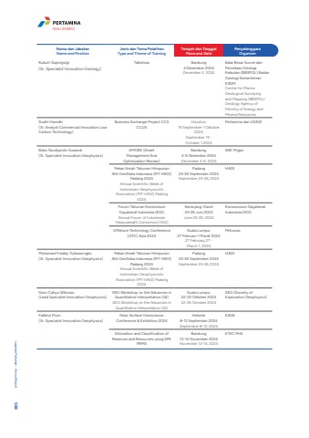 Nama dan JabatanName and PositionJenis dan Tema PelatihanType and Theme of TrainingTempat dan TanggalPlace and DatePenyelenggaraOrganizerKukuh Suprayogi(Sr. Specialist Innovation Geology)Talkshow Bandung4 Desember 2024December 4, 2024Balai Besar Survei dan Pemetaan Geologi Kelautan (BBSPGL) Badan Geologi Kementerian ESDMCenter for Marine Geological Surveying and Mapping (BBSPGL) Geology Agency of Ministry of Energy and Mineral ResourcesDudhi Hamdhi(Sr. Analyst Commercial Innovation Low Carbon Technology)Business Exchange Project CCS CCUSHouston, 19 September-1 Oktober 2024September 19 -October 1 2024Pertamina dan USAIDBoko Nurdiyanto Suwardi(Sr. Specialist Innovation Geophysics)AMORE (Asset Management AndOptimization Review)Bandung, 4-6 Desember 2024December 4-6, 2024SKK MigasPekan Ilmiah Tahunan Himpunan Ahli Geofisika Indonesia (PIT HAGI) Padang 2024Annual Scientific Week of Indonesian Geophysicists Association (PIT HAGI) Padang 2024Padang23-26 September 2024September 23-26, 2024HAGIForum Tahunan Konsorsium Gayaberat Indonesia (KGI)Annual Forum of Indonesian Heavyweight Consortium (KGI)Kamojang-Garut25-26 Juni 2024June 25-26, 2024Konsosrsium Gayaberat Indonesia (KGI)Offshore Technology Conference (OTC) Asia 2024Kuala Lumpur27 Februari-1 Maret 202427 February 27 - March 1, 2024PetronasMohamad Freddy Yulisasongko(Sr. Specialist Innovation Geophysics)Pekan Ilmiah Tahunan Himpunan Ahli Geofisika Indonesia (PIT HAGI) Padang 2024Annual Scientific Week of Indonesian Geophysicists Association (PIT HAGI) Padang 2024Padang23-26 September 2024September 23-26, 2024HAGINoor Cahyo Wibowo(Lead Specialist Innovation Geophysics)SEG Workshop on the Advances in Quantitative Interpretation (QI)SEG Workshop on the Advances in Quantitative Interpretation (QI)Kuala Lumpur22-25 Oktober 202422-25 October 2024SEG (Society of Exploration Geophysics)Fatkhul Muin(Sr. Specialist Innovation Geophysics)Near Surface Geoscience Conference & Exhibition 2024Helsinki8-12 September 2024September 8-12, 2024EAGEEstimation and Classification of Reserves and Resources using SPE PRMSBandung12-14 November 2024November 12-14, 2024ETEC PHELaporan Tahunan %u2022 Annual Report 568HULU ENERGI