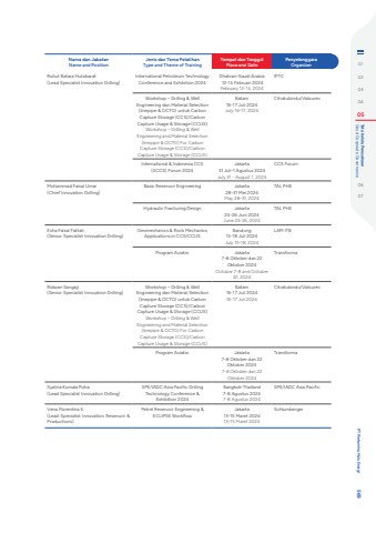 Nama dan JabatanName and PositionJenis dan Tema PelatihanType and Theme of TrainingTempat dan TanggalPlace and DatePenyelenggaraOrganizerRuhut Batara Hutabarat(Lead Specialist Innovation Drilling)International Petroleum Technology Conference and Exhibition 2024Dhahran-Saudi Arabia 12-14 Februari 2024February 12-14, 2024IPTCWorkshop %u2013 Drilling & Well Engineering dan Material Selection (linepipe & OCTG) untuk Carbon Capture Storage (CCS)/Carbon Capture Usage & Storage (CCUS)Workshop %u2013 Drilling & Well Engineering and Material Selection (linepipe & OCTG) For Carbon Capture Storage (CCS)/Carbon Capture Usage & Storage (CCUS)Batam16-17 Juli 2024July 16-17, 2024Citratubindo/ValourecInternational & Indonesia CCS (IICCS) Forum 2024Jakarta31 Juli-1 Agustus 2024July 31 - August 1, 2024CCS ForumMohammad Faisal Umar(Chief Innovation Drilling)Basic Reservoir Engineering Jakarta28-31 Mei 2024May 28-31, 2024TAL PHEHydraulic Fracturing Design Jakarta24-26 Juni 2024June 24-26, 2024TAL PHEEsha Faisal Fattah (Senior Specialist Innovation Drilling)Geomechanics & Rock Mechanics Applications in CCS/CCUSBandung15-18 Juli 2024July 15-18, 2024LAPI ITBProgram Aviator Jakarta7-8 Oktober dan 22 Oktober 2024October 7-8 and October 22, 2024TransformaRidwan Sangaji(Senior Specialist Innovation Drilling)Workshop %u2013 Drilling & Well Engineering dan Material Selection (linepipe & OCTG) untuk Carbon Capture Storage (CCS)/Carbon Capture Usage & Storage (CCUS)Workshop %u2013 Drilling & Well Engineering and Material Selection (linepipe & OCTG) For Carbon Capture Storage (CCS)/Carbon Capture Usage & Storage (CCUS)Batam16-17 Juli 202416-17 Juli 2024Citratubindo/ValourecProgram Aviator Jakarta7-8 Oktober dan 22 Oktober 20247-8 Oktober dan 22 Oktober 2024TransformaSyatria Kumala Putra(Lead Specialist Innovation Drilling)SPE/IADC Asia Pacific Drilling Technology Conference & Exhibition 2024Bangkok-Thailand7-8 Agustus 20247-8 Agustus 2024SPE/IADC Asia PacificVena Florentina E.(Lead Specialist Innovation Reservoir & Productions)Petrel Reservoir Engineering & ECLIPSE WorkflowJakarta13-15 Maret 202413-15 Maret 2024Schlumberger0102030405 Good Corporate Governance Tata kelola Perusahaan0607 PT Pertamina Hulu Energi 569