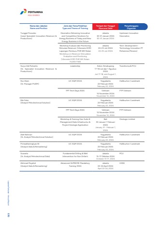 Nama dan JabatanName and PositionJenis dan Tema PelatihanType and Theme of TrainingTempat dan TanggalPlace and DatePenyelenggaraOrganizerTunggal Purwoko(Lead Specialist Innovation Reservoir & Productions)Geomatics Delivering Innovative and Competitive Solutions for Energy Business of Today and New Energy Business in the FutureJakarta30-31 Januari 202430-31 Januari 2024Upstream Innovation GeomaticsWorkshop Evaluasi dan Monitoring Stimulasi Reservoir (Vibroseis EOR) Lapangan Pemburu PHR WK RokanWorkshop on Reservoir Stimulation Evaluation and Monitoring (Vibroseis EOR) PHR WK Rokan Hunter FieldJakarta24-25 Juli 202424-25 Juli 2024Tech. Development I Technology Innovation PT Pertamina (Persero)Suryo Adi Putranto(Sr. Specialist Innovation Reservoir & Productions)Leadership Aston Simatupang17-18 Juli dan 1 Agustus 2024Juli 17-18, and August 1, 2024Transforma & PCUNur Alam (Sr. Manager PUDM)UC SQM 2024 Yogyakarta22 Februari 2024February 22, 2024Halliburton I LandmarkFPT Tech Daya 2024 Vietnam14 November 2024November 14, 2024FTP VietnamRiki Febri(Analyst Petrotechnical Solution)UC SQM 2024 Yogyakarta22 Februari 2024February 22, 2024Halliburton I LandmarkFPT Tech Daya 2024 Vietnam14 November 2024November 14, 2024FTP VietnamWorkshop & Training Geo Suite 8 Management Data Infrastructur & Project Geologix ApplicationBali30 Januari-1 Februari 2024January 31 - Februari 1, 2024Geologix LimitedAde Rahman (Sr. Analyst Petrotechnical Solution)UC SQM 2024 Yogyakarta22 Februari 2024February 22, 2024Halliburton I LandmarkPrimaditaningtyas W. (Analyst Data & Remastering)UC SQM 2024 Yogyakarta22 Februari 2024February 22, 2024Halliburton I LandmarkSuwarta (Sr. Analyst Petrotechnical Data)Fundamental Drilling & Well Intervention for Non Driller%u2019sJakarta15-17 Oktober 2024October 15-17, 2024PCUAkhmad Mujahid(Analyst Data & Remastering)Advanced SUPREME Mandatory Training 2024Jakarta22-24 April 2024April 22-24, 2024HSSELaporan Tahunan %u2022 Annual Report 570HULU ENERGI