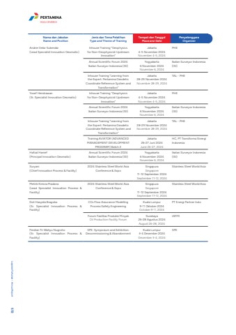 Nama dan JabatanName and PositionJenis dan Tema PelatihanType and Theme of TrainingTempat dan TanggalPlace and DatePenyelenggaraOrganizerAndrie Gelar Sukendar(Lead Specialist Innovation Geomatic)Inhouse Training %u201dGeophysics for Non-Geophysicist Upstream Innovation%u201dJakarta4-5 November 2024November 4-5, 2024PHEAnnual Scientific Forum 2024 Ikatan Surveyor Indonesia (ISI)Yogyakarta6 November 2024November 6, 2024Ikatan Surveyor Indonesia (ISI)Inhouse Training %u201dLearning from the Expert: Pertamina Geodetic Coordinate Reference System and Transformation%u201dJakarta28-29 November 2024November 28-29, 2024TAL - PHEYosef Hendrawan(Sr. Specialist Innovation Geomatic)Inhouse Training %u201dGeophysics for Non-Geophysicist Upstream Innovation%u201dJakarta4-5 November 2024November 4-5, 2024PHEAnnual Scientific Forum 2024 Ikatan Surveyor Indonesia (ISI)Yogyakarta6 November 2024November 6, 2024Ikatan Surveyor Indonesia (ISI)Inhouse Training %u201dLearning from the Expert: Pertamina Geodetic Coordinate Reference System and Transformation%u201dJakarta28-29 November 2024November 28-29, 2024TAL - PHETraining AVIATOR (ADVANCED MANAGEMENT DEVELOPMENT PROGRAM) Batch 2Jakarta26-27 Juni 2024June 26-27, 2024HC, PT Transforma Sinergi IndonesiaHafzal Hanief(Principal Innovation Geomatic)Annual Scientific Forum 2024 Ikatan Surveyor Indonesia (ISI)Yogyakarta6 November 2024November 6, 2024Ikatan Surveyor Indonesia (ISI)Suryani(Chief Innovation Process & Facility)2024 Stainless Steel World Asia Conference & ExpoSingapuraSingapore11-12 September 2024September 11-12, 2024Stainless Steel World AsiaMetrik Kresna Pradana(Lead Specialist Innovation Process & Facility)2024 Stainless Steel World Asia Conference & ExpoSingapuraSingapore11-12 September 2024September 11-12, 2024Stainless Steel World AsiaDoli Hasyida Bragoba (Sr. Specialist Innovation Process & Facility)CO2 Flow Assurance Modelling Process Safety EngineeringKuala Lumpur9-11 Oktober 2024October 9-11, 2024PT Energi Partner IndoForum Fasilitas Produksi MinyakOil Production Facility ForumSurabaya26-28 Agustus 2024August 26-28, 2024IAFMIFerdian Tri Wahyu Nugroho(Sr. Specialist Innovation Process & Facility)SPE: Symposium and Exhibition: Decommissioning & AbandonmentKuala Lumpur3-4 Desember 2024December 3-4, 2024SPELaporan Tahunan %u2022 Annual Report 572HULU ENERGI