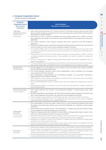 Komponen Pengendalian InternalInternal Control ComponentsKomponen Pengendalian InternalInternal Control ComponentsUraian PenerapanDescription of ImplementationLingkungan Pengendalian InternalInternal Control Environment1. Sistem WBS yang tersentralisasi di PT Pertamina (Persero) memberikan perlakuan yang sama bagi setiap laporan dan/atau pengaduan yang diajukan dan menjunjung tinggi asas praduga tidak bersalah bagi pihak yang dilaporkan dan/atau diadukan.2. PHE menyusun code of conduct dan kebijakan lain yang mengatur praktik bisnis, conflicts of interestatau standar etika, dan perilaku bisnis. Pedoman tersebut dapat diakses secara langsung oleh pekerja dan stakeholder.3. PHE memiliki mekanisme untuk mengatur hubungan kerja antara manajemen pusat dan manajemen operasional.4. PHE telah menetapkan struktur organisasi formal yang memberikan gambaran jelas atas alur informasi, baik ke atas, ke bawah, dan antar fungsi di dalam pengelolaan kegiatan Perusahaan.1. The centralized WBS system at PT Pertamina (Persero) provides equal treatment for every report and/or complaint submitted and upholds the principle of presumption of innocence for the reported and/or complained party.2. PHE develops a code of conduct and other policies that govern business practices, conflicts of interest or ethical standards, and business behavior. These guidelines are directly accessible to workers and stakeholders.3. PHE has a mechanism to regulate working relationships between the central management and the operational management.4. PHE has established a formal organizational structure that provides a clear picture of the flow of information, both upwards, downwards, and between functions in the management of the Company's activities.Penilaian RisikoRisk Assessment1. PHE menetapkan visi, misi, dan pedoman untuk mencapai visi dan misi tersebut, serta mengkomunikasikan ke seluruh pekerja dan pihak terkait lainnya.2. PHE memiliki kebijakan Manajemen Risiko untuk mengidentifikasi, menilai, memetakan, dan memitigasi risiko yang berasal dari faktor eksternal.3. PHE mengantisipasi, mengidentifikasi, dan menindaklanjuti kejadian rutin yang dapat memengaruhi kegiatan operasional dan tujuan Perusahaan.1. PHE establishes a vision, missions, and guidelines to achieve the vision and missions, and communicates them to all workers and other related parties.2. PHE has a Risk Management policy to identify, assess, map, and mitigate risks originating from external factors.3. PHE anticipates, identifies, and follows up on routine events that may impact the Company's operational activities and objectives.Aktivitas PengendalianControl Activities1. PHE memiliki pedoman dan prosedur untuk pelaksanaan kegiatan di masing-masing fungsi dalam Perusahaan.2. Aktivitas pengendalian yang ditetapkan oleh PHE diimplementasikan dengan kebijakan dan prosedur yang jelas, fungsi pengawasan yang terpadu, dan tindak lanjut atas pelanggaran yang terjadi.4. PHE has guidelines and procedures for implementing activities in each function within the Company.5. Control activities established by PHE are implemented with clear policies and procedures, integrated monitoring functions, and follow-up on violations that occur.Informasi dan KomunikasiInformation and Communication1. PHE mengumpulkan informasi dari dalam maupun dari luar untuk memperoleh gambaran akan kinerja Perusahaan yang berhubungan dengan tujuan yang telah ditetapkan dan melaporkan hasilnya kepada manajemen.2. Pengembangan atau perubahan sistem di PHE berdasarkan IT strategic plan yang berhubungan dengan rencana strategis dan responsif terhadap tujuan Perusahaan.3. Tugas dan tanggung jawab dikomunikasikan ke setiap pekerja, sehingga pekerja dapat mengerti tujuan kerja dan proses yang diperlukan dalam mencapai tujuan tersebut.1. PHE collects information from both inside and outside to obtain an overview of the Company's performance in relation to the objectives that have been set and reports the results to the management.2. Development or changes to systems at PHE based on IT strategic plans that are related to strategic plans and responsive to the Company's objectives.3. Duties and responsibilities are communicated to each worker, so that workers can understand the work objectives and the processes required to achieve those objectives.PemantauanMonitoring1. Internal control applied in every operational activity of PHE must be stated in the form of documentation.2. Any information and complaints from external parties of the Company obtained through the Pertamina Contact Center are identified and evaluated in a centralized manner by PT Pertamina (Persero). Any complaints that identify control weaknesses must be followed up with improvements.3. Each audit finding resulting from Internal Audit activities at PHE is confirmed to the relevant Process Owner for approval before being reported to the Board of Directors and the Audit Committee.0102030405 Good Corporate Governance Tata kelola Perusahaan0607 PT Pertamina Hulu Energi 579
