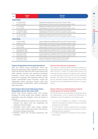 No TanggalDateAktivitasActivityControl Owner1 15-30 April 2024April 15-30, 2024Pelaksanaan Sertifikasi ICoFR TLC & ITGC Triwulan I 2024Implementation of ICoFR TLC & ITGC Certification Quarter I 20242 1-31 Juli 2024Juli 1-31, 2024Pelaksanaan Sertifikasi ICoFR TLC & ITGC Triwulan II 2024Implementation of ICoFR TLC & ITGC Certification Quarter II 20243 1-31 Oktober 2024October 1-31, 2024Pelaksanaan Sertifikasi ICoFR TLC & ITGC Triwulan III 2024Implementation of ICoFR TLC & ITGC Certification Quarter III 20244 1-31 Januari 2025Januari 1-31, 2025Pelaksanaan Sertifikasi ICoFR TLC & ITGC Triwulan IV 2024Implementation of ICoFR TLC & ITGC Certification Quarter IV 2024Control Group1 7 Februari 2024February 7, 2024Laporan Pelaksanaan Sertifikasi ICoFR TLC & ITGC Triwulan IV 2023Implementation of ICoFR TLC & ITGC Certification Quarter IV 20232 25 Juni 2024Juny 25, 2024Laporan Pelaksanaan Sertifikasi ICoFR TLC & ITGC Triwulan I 2024Implementation of ICoFR TLC & ITGC Certification Quarter I 20243 18 September 2024September 18, 2024Laporan Pelaksanaan Sertifikasi ICoFR TLC & ITGC Triwulan II 2024Implementation of ICoFR TLC & ITGC Certification Quarter II 20244 9 Desember 2024December 9, 2024Laporan Pelaksanaan Sertifikasi ICoFR TLC & ITGC Triwulan III 2024Implementation of ICoFR TLC & ITGC Certification Quarter III 20245 16 Desember 2024December 16, 2024Laporan Pelaksanaan Sertifikasi ICoFR ELC Tahun 2024ICoFR ELC Certification Implementation Report 2024Tinjauan Pengendalian Internal pada OperasionalSalah satu metode tinjauan pengendalian internal atas operasional dilaksanakan melalui mekanisme assurance oleh Fungsi Internal Audit. Pada tahun 2024, Fungsi Internal Auditsudah melakukan assurance atau penjaminan berdasarkan persetujuan rencana kerja terhadap beberapa kegiatan operasional di lingkungan PHE Subholding Upstream. Hasil tinjauan memperlihatkan bahwa Perusahaan memiliki dan melaksanakan Standar Operasional Prosedur (SOP) yang mempertimbangkan praktik-praktik terbaik pertambangan migas yang berlaku.Hasil Tinjauan (Reviu) atas Pelaksanaan Sistem Pengendalian Internal Tahun Buku 2024Internal Audit memiliki tanggung jawab untuk meninjau penerapan SPI secara berkala untuk mengukur efektivitas pengendalian yang telah ditetapkan. Tujuan dari tinjauan di antaranya:1. Memastikan keandalan dan integritas informasi akuntansi, keuangan, dan operasi, serta cara menghasilkan dan melaporkan informasi tersebut.2. Memastikan bahwa sistem sesuai dengan kebijakan Perusahaan, tujuan, standar, dan prosedur, serta peraturan perundang-undangan yang berlaku.3. Melakukan evaluasi atas kecukupan pengamanan aset Perusahaan.Internal Control Review on OperationsOne method of reviewing internal control over operations is conducted through an assurance mechanism by the Internal Audit Function. In 2024, the Internal Audit Function has conducted assurance based on the approval of the work plan for several operational activities within the PHE Subholding Upstream. The results of the review show that the Company has and implements Standard Operating Procedures (SOPs) that take into account applicable best practices in oil and gas mining.Results of Review of Implementation of Internal Control System for Financial Year2024The Internal Audit has the responsibility to periodically review the implementation of SPI to measure the effectiveness of established controls. The objectives of the review include:1. To ensure the reliability and integrity of accounting, financial, and operational information, and how to generate and report such information.2. To ensure that the system complies with the Company%u2019s policies, objectives, standards and procedures, as well as applicable laws and regulations.3. To conduct an evaluation of the adequacy of the Company's asset security.0102030405 Good Corporate Governance Tata kelola Perusahaan0607 PT Pertamina Hulu Energi 581