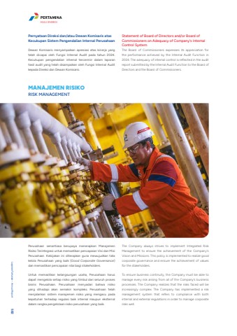 Perusahaan senantiasa berupaya menerapkan Manajemen Risiko Terintegrasi untuk memastikan pencapaian Visi dan Misi Perusahaan. Kebijakan ini diterapkan guna mewujudkan tata kelola Perusahaan yang baik (Good Corporate Governance) dan memastikan pencapaian nilai bagi stakeholders.Untuk memastikan kelangsungan usaha, Perusahaan harus dapat mengelola setiap risiko yang timbul dari seluruh proses bisnis Perusahaan. Perusahaan menyadari bahwa risiko yang dihadapi akan semakin kompleks. Perusahaan telah menjalankan sistem manajemen risiko yang mengacu pada kepatuhan terhadap regulasi baik internal maupun eksternal dalam rangka pengelolaan risiko perusahaan yang baik. The Company always strives to implement Integrated Risk Management to ensure the achievement of the Company's Vision and Missions. This policy is implemented to realize good corporate governance and ensure the achievement of values for the stakeholders.To ensure business continuity, the Company must be able to manage every risk arising from all of the Company's business processes. The Company realizes that the risks faced will be increasingly complex. The Company has implemented a risk management system that refers to compliance with both internal and external regulations in order to manage corporate risks well.MANAJEMEN RISIKORISK MANAGEMENTPernyataan Direksi dan/atau Dewan Komisaris atas Kecukupan Sistem Pengendalian Internal PerusahaanDewan Komisaris menyampaikan apresiasi atas kinerja yang telah dicapai oleh Fungsi Internal Audit pada tahun 2024. Kecukupan pengendalian internal tercermin dalam laporan hasil audit yang telah disampaikan oleh Fungsi Internal Audit kepada Direksi dan Dewan Komisaris. Statement of Board of Directors and/or Board of Commissioners on Adequacy of Company's Internal Control SystemThe Board of Commissioners expresses its appreciation for the performance achieved by the Internal Audit Function in 2024. The adequacy of internal control is reflected in the audit report submitted by the Internal Audit Function to the Board of Directors and the Board of Commissioners.Laporan Tahunan %u2022 Annual Report 582HULU ENERGI