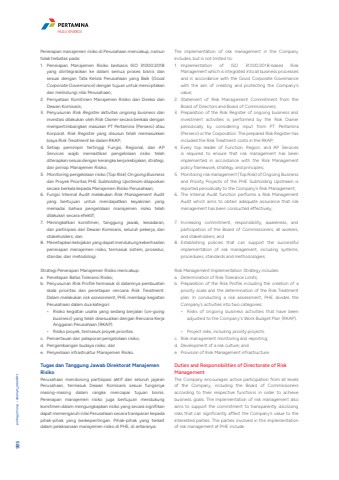 Penerapan manajemen risiko di Perusahaan mencakup, namun tidak terbatas pada:1. Penerapan Manajemen Risiko berbasis ISO 31000:2018 yang diintegrasikan ke dalam semua proses bisnis dan sesuai dengan Tata Kelola Perusahaan yang Baik (Good Corporate Governance) dengan tujuan untuk menciptakan dan melindungi nilai Perusahaan;2. Pernyataan Komitmen Manajemen Risiko dari Direksi dan Dewan Komisaris;3. Penyusunan Risk Register aktivitas ongoing business dan investasi dilakukan oleh Risk Owner secara berkala dengan mempertimbangkan masukan PT Pertamina (Persero) atau Korporat. Risk Register yang disusun telah memasukkan biaya Risk Treatment ke dalam RKAP;4. Setiap pemimpin tertinggi Fungsi, Regional, dan AP Services wajib memastikan pengelolaan risiko telah diterapkan sesuai dengan kerangka kerja kebijakan, strategi, dan prinsip Manajemen Risiko;5. Monitoring pengelolaan risiko (Top Risk) On going Businessdan Proyek Prioritas PHE Subholding Upstream dilaporkan secara berkala kepada Manajemen Risiko Perusahaan;6. Fungsi Internal Audit melakukan Risk Management Audit yang bertujuan untuk mendapatkan keyakinan yang memadai bahwa pengelolaan manajemen risiko telah dilakukan secara efektif;7. Meningkatkan komitmen, tanggung jawab, kesadaran, dan partisipasi dari Dewan Komisaris, seluruh pekerja, dan stakeholders; dan8. Menetapkan kebijakan yang dapat mendukung keberhasilan penerapan manajemen risiko, termasuk sistem, prosedur, standar, dan metodologi. Strategi Penerapan Manajemen Risiko mencakup:a. Penetapan Batas Toleransi Risiko;b. Penyusunan Risk Profile termasuk di dalamnya pembuatan skala prioritas dan penetapan rencana Risk Treatment. Dalam melakukan risk assessment, PHE membagi kegiatan Perusahaan dalam dua kategori:%u2022 Risiko kegiatan usaha yang sedang berjalan (on-going business) yang telah disesuaikan dengan Rencana Kerja Anggaran Perusahaan (RKAP).%u2022 Risiko proyek, termasuk proyek prioritas. c. Pemantauan dan pelaporan pengelolaan risiko;d. Pengembangan budaya risiko; dane. Penyediaan infrastruktur Manajemen Risiko. Tugas dan Tanggung Jawab Direktorat Manajemen RisikoPerusahaan mendorong partisipasi aktif dari seluruh jajaran Perusahaan, termasuk Dewan Komisaris sesuai fungsinya masing-masing dalam rangka mencapai tujuan bisnis. Penerapan manajemen risiko juga bertujuan mendukung komitmen dalam mengungkapkan risiko yang secara signifikan dapat memengaruhi nilai Perusahaan secara transparan kepada pihak-pihak yang berkepentingan. Pihak-pihak yang terkait dalam pelaksanaan manajemen risiko di PHE, di antaranya:The implementation of risk management in the Company includes, but is not limited to:1. Implementation of ISO 31000:2018-based Risk Management which is integrated into all business processes and in accordance with the Good Corporate Governance with the aim of creating and protecting the Company's value;2. Statement of Risk Management Commitment from the Board of Directors and Board of Commissioners;3. Preparation of the Risk Register of ongoing business and investment activities is performed by the Risk Owner periodically by considering input from PT Pertamina (Persero) or the Corporation. The prepared Risk Register has included the Risk Treatment costs in the RKAP;4. Every top leader of Function, Region, and AP Services is required to ensure that risk management has been implemented in accordance with the Risk Management policy framework, strategy, and principles;5. Monitoring risk management (Top Risk) of Ongoing Business and Priority Projects of the PHE Subholding Upstream is reported periodically to the Company's Risk Management;6. The Internal Audit function performs a Risk Management Audit which aims to obtain adequate assurance that risk management has been conducted effectively;7. Increasing commitment, responsibility, awareness, and participation of the Board of Commissioners, all workers, and stakeholders; and8. Establishing policies that can support the successful implementation of risk management, including systems, procedures, standards and methodologies.Risk Management Implementation Strategy includes:a. Determination of Risk Tolerance Limits;b. Preparation of the Risk Profile including the creation of a priority scale and the determination of the Risk Treatment plan. In conducting a risk assessment, PHE divides the Company's activities into two categories:%u2022 Risks of ongoing business activities that have been adjusted to the Company's Work Budget Plan (RKAP).%u2022 Project risks, including priority projects.c. Risk management monitoring and reporting;d. Development of a risk culture; ande. Provision of Risk Management infrastructure.Duties and Responsibilities of Directorate of Risk Management The Company encourages active participation from all levels of the Company, including the Board of Commissioners according to their respective functions in order to achieve business goals. The implementation of risk management also aims to support the commitment to transparently disclosing risks that can significantly affect the Company's value to the interested parties. The parties involved in the implementation of risk management at PHE include:Laporan Tahunan %u2022 Annual Report 586HULU ENERGI