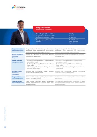 Asep ChaerudinVP Risk Strategy & GovernancePeriode Menjabat / Terms of Office Usia / AgeMenjabat Sejak 1 September 2024Serving since September 1, 202454 tahun54 years oldKewarganegaraan / Citizenship Domisili / DomicileIndonesia Depok, Jawa BaratDepok, West JavaRiwayat PenunjukanAppointment HistoryDiangkat sebagai VP Risk Strategy & Governance berdasarkan Surat Keputusan No. SKMJ-00164/K20000/2024-S8 tanggal 1 September 2024.Diangkat sebagai VP Risk Strategy & Governance berdasarkan Surat Keputusan No. SKMJ-00164/K20000/2024-S8 tanggal 1 September 2024. Riwayat PendidikanEducational BackgroundSarjana (S1) Akuntansi di Universitas Persada Indonesia YAI Jakarta (1997)Sarjana (S1) Akuntansi di Universitas Persada Indonesia YAI Jakarta (1997)Riwayat PekerjaanEmployment History%u2022 VP Policy & Risk Management, PT Pertamina Hulu Energi (2023-2024)%u2022 Sr. Manager Financing, PT Pertamina Hulu Energi (2021-2023)%u2022 VP Treasury, PT Pertamina Drilling Services Indonesia (2020-2021)%u2022 VP Policy & Risk Management, PT Pertamina Hulu Energi (2023-2024)%u2022 Sr. Manager Financing, PT Pertamina Hulu Energi (2021-2023)%u2022 VP Treasury, PT Pertamina Drilling Services Indonesia (2020-2021)Sertifikasi ProfesiProfessional CertificationCertified Risk Professional, Badan Nasional Sertifkasi Profesi (BNSP) (2024)Certified Risk Professional, National Professional Certification Agency (BNSP) (2024)Rangkap JabatanConcurrent PositionsTidak memiliki rangkap jabatan, baik di dalam maupun di luar Perusahaan.Holds no concurrent positions, either inside or outside the Company.Hubungan AfiliasiAffiliated RelationshipsTidak memiliki hubungan afiliasi dengan/atau anggota Dewan Komisaris, anggota Direksi, atau pemegang saham.Has no affiliate relationship with members of the Board of Commissioners, members of the Board of Directors, or the shareholders.Laporan Tahunan %u2022 Annual Report 588HULU ENERGI