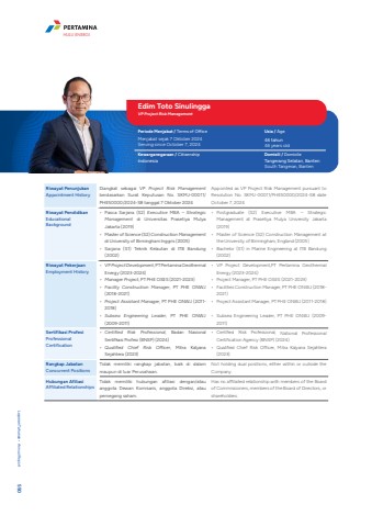 Riwayat PenunjukanAppointment HistoryDiangkat sebagai VP Project Risk Managementberdasarkan Surat Keputusan No. SKMJ-00011/PHE50000/2024-S8 tanggal 7 Oktober 2024Appointed as VP Project Risk Management pursuant to Resolution No. SKMJ-00011/PHE50000/2024-S8 date October 7, 2024Riwayat PendidikanEducational Background%u2022 Pasca Sarjana (S2) Executive MBA %u2013 Strategic Management di Universitas Prasetiya Mulya Jakarta (2019)%u2022 Master of Science (S2) Construction Managementdi University of Birmingham Inggris (2005)%u2022 Sarjana (S1) Teknik Kelautan di ITB Bandung (2002)%u2022 Postgraduate (S2) Executive MBA %u2013 Strategic Management at Prasetiya Mulya University Jakarta (2019)%u2022 Master of Science (S2) Construction Management at the University of Birmingham, England (2005)%u2022 Bachelor (S1) in Marine Engineering at ITB Bandung (2002)Riwayat PekerjaanEmployment History%u2022 VP Project Development, PT Pertamina Geothermal Energy (2023-2024)%u2022 Manager Project, PT PHE OSES (2021-2023)%u2022 Facility Construction Manager, PT PHE ONWJ (2018-2021)%u2022 Project Assistant Manager, PT PHE ONWJ (2011-2018)%u2022 Subsea Engineering Leader, PT PHE ONWJ (2009-2011)%u2022 VP Project Development,PT Pertamina Geothermal Energy (2023-2024)%u2022 Project Manager, PT PHE OSES (2021-2023)%u2022 Facilities Construction Manager, PT PHE ONWJ (2018-2021)%u2022 Project Assistant Manager, PT PHE ONWJ (2011-2018)%u2022 Subsea Engineering Leader, PT PHE ONWJ (2009-2011)Sertifikasi ProfesiProfessional Certification%u2022 Certified Risk Professional, Badan Nasional Sertifkasi Profesi (BNSP) (2024)%u2022 Qualified Chief Risk Officer, Mitra Kalyana Sejahtera (2023)%u2022 Certified Risk Professional, National Professional Certification Agency (BNSP) (2024) %u2022 Qualified Chief Risk Officer, Mitra Kalyana Sejahtera (2023)Rangkap JabatanConcurrent PositionsTidak memiliki rangkap jabatan, baik di dalam maupun di luar Perusahaan.Not holding dual positions, either within or outside the Company.Hubungan AfiliasiAffiliated RelationshipsTidak memiliki hubungan afiliasi dengan/atau anggota Dewan Komisaris, anggota Direksi, atau pemegang saham.Has no affiliated relationship with members of the Board of Commissioners, members of the Board of Directors, or shareholders.Edim Toto SinulinggaVP Project Risk ManagementPeriode Menjabat / Terms of Office Usia / AgeMenjabat sejak 7 Oktober 2024Serving since October 7, 202446 tahun46 years oldKewarganegaraan / Citizenship Domisili / DomicileIndonesia Tangerang Selatan, BantenSouth Tangeran, BantenLaporan Tahunan %u2022 Annual Report 590HULU ENERGI
