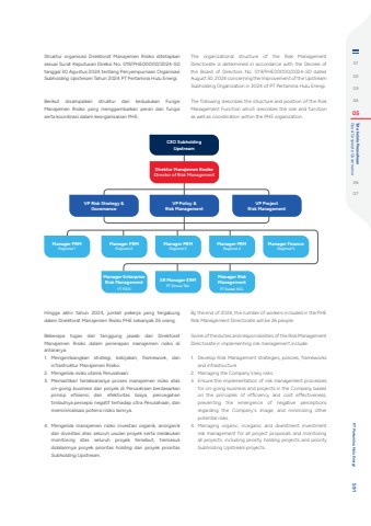 Struktur organisasi Direktorat Manajemen Risiko ditetapkan sesuai Surat Keputusan Direksi No. 019/PHE00000/2024-S0 tanggal 30 Agustus 2024 tentang Penyempurnaan Organisasi Subholding Upstream Tahun 2024 PT Pertamina Hulu Energi.Berikut disampaikan struktur dan kedudukan Fungsi Manajemen Risiko yang menggambarkan peran dan fungsi serta koordinasi dalam keorganisasian PHE. The organizational structure of the Risk Management Directorate is determined in accordance with the Decree of the Board of Directors No. 019/PHE00000/2024-S0 dated August 30, 2024 concerning the Improvement of the Upstream Subholding Organization in 2024 of PT Pertamina Hulu Energi.The following describes the structure and position of the Risk Management Function which describes the role and function as well as coordination within the PHE organization.Hingga akhir tahun 2024, jumlah pekerja yang tergabung dalam Direktorat Manajemen Risiko PHE sebanyak 26 orang.Beberapa tugas dan tanggung jawab dari Direktorat Manajemen Risiko dalam penerapan manajemen risiko di antaranya:1. Mengembangkan strategi, kebijakan, framework, dan infrastruktur Manajemen Risiko.2. Mengelola risiko utama Perusahaan.3. Memastikan terlaksananya proses manajemen risiko atas on-going business dan proyek di Perusahaan berdasarkan prinsip efisiensi dan efektivitas biaya, pencegahan timbulnya persepsi negatif terhadap citra Perusahaan, dan meminimalisasi potensi risiko lainnya.4. Mengelola manajemen risiko investasi organik, anorganik dan divestasi atas seluruh usulan proyek serta melakukan monitoring atas seluruh proyek tersebut, termasuk didalamnya proyek prioritas holding dan proyek prioritas Subholding Upstream.By the end of 2024, the number of workers included in the PHE Risk Management Directorate will be 26 people.Some of the duties and responsibilities of the Risk Management Directorate in implementing risk management include:1. Develop Risk Management strategies, policies, frameworks and infrastructure.2. Managing the Company's key risks.3. Ensure the implementation of risk management processes for on-going business and projects in the Company based on the principles of efficiency and cost effectiveness, preventing the emergence of negative perceptions regarding the Company's image, and minimizing other potential risks.4. Managing organic, inorganic and divestment investment risk management for all project proposals and monitoring all projects, including priority holding projects and priority Subholding Upstream projects.Direktur Manajemen ResikoDirector of Risk ManagementVP Policy & Risk ManagementVP Risk Strategy & GovemanceVP Project Risk ManagementCEO Subholding UpstreamManager PRMRegional 1Manager PRMRegional 2Manager Enterprise Risk ManagementPT PDSIManager Risk ManagementPT Badak NGLManager PRMRegional 3SR Manager ERM PT Elnusa Tbk.Manager PRMRegional 4Manager FinanceRegional 50102030405 Good Corporate Governance Tata kelola Perusahaan0607 PT Pertamina Hulu Energi 591