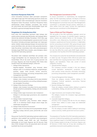 Komitmen Manajemen Risiko PHEUntuk memastikan komitmen dalam penerapan manajemen risiko dalam lingkungan PHE Subholding Upstream, Direksi dan Dewan Komisaris telah menandatangani dokumen Komitmen Manajemen Risiko Perusahaan. Komitmen Manajemen Risiko diartikulasikan melalui kebijakan, pernyataan, atau bentuk lain yang tertulis dan secara jelas menyampaikan tujuan dan komitmen organisasi terhadap Manajemen Risiko.Pengelolaan On-Going Business RiskProfil risiko PHE Subholding Upstream tidak terlepas dari analisis potensi dampak yang ditimbulkan oleh berbagai faktor internal dan eksternal terhadap Perusahaan. Profil risiko juga dipengaruhi potensi dampak kegiatan operasional, dan finansial Perusahaan terhadap pemangku kepentingan dan lingkungan sekitar. Setelah melalui beberapa tahapan risk assessment dan proses identifikasi risiko, dari seluruh risiko yang telah dianalisis maka Perusahaan menentukan risiko-risiko yang berpengaruh terhadap target RKAP tahun berjalan, yang terangkum dalam Top Risk PHE Subholding Upstream.Perusahaan telah melakukan identifikasi dan penilaian risiko hingga mendapatkan top risk. Sepanjang tahun 2024, telah teridentifikasi 128 all risk event dari on-going business riskdi Fungsi, Regional, dan Anak Perusahaan PHE. Risiko-risiko tersebut terdiri dari beberapa kategori, antara lain:1. Kategori Risiko OperasionalKegiatan-kegiatan Perusahaan yang termasuk dalam kategori risiko ini di antaranya eksplorasi, pengembangan, produksi, supply chain process, human resources, information technology, processing, transportation, asset management, dan HSSE.2. Kategori Risiko Financial ManagementKategori risiko tersebut mencakup hal-hal yang berkaitan dengan financial operation, accounting, strategi keuangan, dan perpajakan Perusahaan.3. Kategori Risiko Business StrategyKategori risiko tersebut mencakup hal-hal yang berkaitan dengan growth & sustainability, strategi, dan perencanaan Perusahaan.4. Kategori Risiko Legal, Governance, dan ComplianceKategori ini mencakup legal, governance, dan compliancePerusahaan.5. Kategori Risiko Corporate ImageKegiatan Perusahaan yang termasuk dalam kategori risiko ini di antaranya terkait dengan brand image dan stakeholder management.6. Kategori Risiko Business EnvironmentKategori risiko ini mencakup hal-hal yang berkaitan dengan teknologi, budaya, ekonomi, pasar, pemerintah, dan sosial politik.Penyusunan Top Risk PHE Subholding Upstream adalah proses penentuan risiko kualitatif dan kuantitatif yang berpengaruh signifikan terhadap target RKAP dan arah Perusahaan berdasarkan all risk Fungsi, Regional, dan AP Services. Pada tahun 2024, terdapat 14 top risk yang terdiri dari 6 risk eventkuantitatif dan 8 risk event kualitatif.Risk Management Commitment of PHETo ensure commitment to implementing risk management within the PHE Subholding Upstream, the Board of Directors and the Board of Commissioner has signed the Company's Risk Management Commitment document. Risk Managements' commitment is articulated through policies, statements, or other written forms and clearly conveys the organization's objectives and commitment to Risk Management.Types of Risks and Their MitigationThe risk profile of the PHE Subholding Upstream cannot be separated from the analysis of potential impacts caused by various internal and external factors on the Company. The risk profile is also influenced by the potential impact of the Company's operational and financial activities on stakeholders and the surrounding environment. After going through several stages of risk assessment and risk identification processes, from all the risks that have been analyzed, the Company determines the risks that affect the current year's RKAP target, which are summarized in the Top Risk of the PHE Subholding Upstream.The company has conducted risk identification and assessment to obtain top risks. Throughout 2024, 128 all-risk events have been identified from ongoing business risks in PHE Functions, Regions, and Subsidiaries. These risks consist of several categories, including:1. Operational Risk CategoryThe Company's activities included in this risk category include exploration, development, production, supply chain process, human resources, information technology, processing, transportation, asset management, and HSSE.2. Financial Management Risk CategoryThese risk category includes matters relating to the Company's financial operations, accounting, financial strategy and taxation.3. Business Strategy Risk CategoryThese risk category includes matters relating to growth & sustainability, strategy, and planning of the Company.4. Legal, Governance, and Compliance Risk CategoryThis category includes the Company's legal, governance, and compliance.5. Corporate Image Risk CategoryActivities of the Company that fall into this risk category include those related to brand image and stakeholder management.6. Business Environment Risk CategoryThis risk category includes matters relating to technology, culture, economy, market, government and socio-politics.The preparation of Top Risk of the PHE Subholding Upstream is a process of determining qualitative and quantitative risks that have a significant impact on the RKAP target and the direction of the Company based on all risks of Functions, Regions, and AP Services. In 2024, there are 14 top risks consisting of 6 quantitative risk events and 8 qualitative risk events.Laporan Tahunan %u2022 Annual Report 594HULU ENERGI