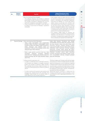 No. KategoriCategory Top Risk Mitigasi/Pengelolaan RisikoRisk Mitigation/ManagementRisk of not achieving financial targets.%u2022 The challenges faced by the Company in achieving profit targets include the decline in oil and gas prices, the increase in production operating costs, and the fulfillment of obligations not budgeted in the RKAP.%u2022 There is a potential for a decrease in asset value due to falling oil prices and the Company's operational constraints.%u2022 The Company seeks to reduce this risk, including by submitting a determination of gas allocation and prices in accordance with applicable regulations, optimizing the feasibility of oil and gas projects against various oil and gas price scenarios, and ensuring optimization of production operating costs by the Cross-Function Team periodically, including potential unbudgeted liabilities. The Company also continues to build good relationships and actively coordinate with relevant stakeholders to continue to maintain the Company's profitability level.%u2022 The company makes efforts to optimize the increase in reserves and utilization of existing assets effectively and efficiently by monitoring oil price fluctuations, simulating asset valuations periodically, and coordinating with operators and stakeholders.3 Business Strategy Risiko optimalisasi portofolio Perusahaan.%u2022 Dalam rangka meningkatkan serta mengamankan produksi migas, Perusahaan mencanangkan proyek investasi anorganik dari kegiatan Merger & Acquisition(M&A). Tantangan yang dihadapi antara lain keterbatasan informasi untuk peluang investasi serta adanya pengaruh faktor eksternal. %u2022 Dalam rangka optimasi portofolio aset hulu, maka Perusahaan melakukan perubahan beberapa kepemilikan WK. Tantangan yang dihadapi antara lain kurang optimalnya nilai aset yang disepakati dengan calon mitra. Company portfolio optimization risk.%u2022 In order to increase and secure oil and gas production, the Company has initiated an inorganic investment project from Merger & Acquisition (M&A) activities. The challenges faced include limited information for investment opportunities and the influence of external factors.%u2022 In order to optimize the upstream asset portfolio, the Company has changed several WK ownerships. The challenges faced include the non-optimal value of assets agreed upon with prospective partners.Upaya yang dilakukan Perusahaan yaitu dengan memanfaatkan informasi market dari investment bank dan data sekunder lainnya dari pihak ketiga untuk memonitor informasi mengenai peluang investasi melalui aktivitas M&A, serta terus berkoordinasi dengan stakeholder untuk memonitor informasi mengenai opportunity investasi melalui akuisisi WK Expiry, konsekuensi kontrak, dan Indonesian Participant Rights.Melakukan koordinasi internal dalam penentuan portofolio Perusahaan dan kaitannya dengan valuasi, serta memanfaatkan informasi mengenai potential buyer dari pihak ketiga. The efforts made by the Company are by utilizing market information from investment banks and other secondary data from third parties to monitor information regarding investment opportunities through M&A activities, as well as continuing to coordinate with stakeholders to monitor information regarding investment opportunities through the acquisition of WK Expiry, contract consequences, and Indonesian Participant Rights.Conducting internal coordination in determining the Company's portfolio and its relation to valuation, as well as utilizing information regarding potential buyers from third parties.0102030405 Good Corporate Governance Tata kelola Perusahaan0607 PT Pertamina Hulu Energi 597
