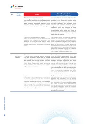 No. KategoriCategory Top Risk Mitigasi/Pengelolaan RisikoRisk Mitigation/ManagementRisiko tidak tercapainya realisasi investasi.Industri migas merupakan industri yang membutuhkan biaya investasi yang tinggi yang penuh ketidakpastian dalam penyerapannya. Risiko yang dihadapi di antaranya adalah mundurnya penyelesaian pekerjaan proyek, kerusakan peralatan, kendala operasional, kendala perizinan, cost overrun, dan faktor eksternal lainnya. The risk of not achieving investment realization.The oil and gas industry is an industry that requires high investment costs that are full of uncertainty in their absorption. The risk faced includes delays in project completion, equipment damage, operational constraints, licensing constraints, cost overruns, and other external factors.Upaya yang dilakukan Perusahaan untuk menurunkan dampak dan kemungkinan risiko tersebut yaitu melakukan evaluasi program kerja investasi dengan lintas fungsi, pengawasan pekerjaan proyek investasi, menyiapkan contigency plan, percepatan proses pengadaan, serta memastikan nilai barang dan jasa mengacu pada market assessment. Meningkatkan kematangan teknis dan non-teknis di setiap tahapan proyek pengembangan hulu migas serta mengintegrasikan seluruh proses kerja terkait ke dalam suatu proses kerja pengembangan yang efektif agar proyek berjalan secara on time, on budget, on specification, dan on return. The Company's efforts to reduce the impact and potential risk include evaluating investment work programs with cross-functions, supervising investment project work, preparing contingency plans, accelerating procurement processes, and ensuring the value of goods and services refers to market assessments. Increasing technical and non-technical maturity at each stage of upstream oil and gas development projects and integrating all related work processes into an effective development work process so that the project runs on time, on budget, on specification, and on return.4 Legal, Governance, & ComplianceRisiko hukum. Perusahaan dalam menjalankan kegiatan operasional tidak lepas dari bermitra dengan pihak lain. Terdapat potensi interpretasi yang berbeda antara para pihak atas ketentuan dalam perjanjian dan/atau hukum dan perundang-undangan, perselisihan hukum, atau proses hukum lainnya. Proses tersebut, terlepas dari hasilnya, dapat menimbulkan biaya tidak terduga dan publisitas negatif bagi reputasi Perusahaan. Legal risk.The Company in performing operational activities cannot be separated from partnering with other parties. There is the potential for different interpretations between the parties regarding the provisions of the agreement and/or laws and regulations, legal disputes, or other legal proceedings. Such proceedings, regardless of the outcome, can result in unexpected costs and negative publicity for the Company's reputation.Perusahaan berupaya untuk menurunkan risiko tersebut melalui penyusunan klausula-klausula hukum yang mencerminkan hasil pembahasan yang komprehensif dengan counterparts, sehingga dapat meminimalisasi perbedaan interpretasi, berkoordinasi aktif dengan pihak lembaga hukum terkait dan kuasa hukum eksternal, serta stakeholder lainnya. Perusahaan terus melakukan pengelolaan aspek hukum yang mencakup antara lain mengidentifikasi potensi permasalahan hukum yang diperlukan dan dapat memengaruhi kinerja Perusahaan melalui pemberian informasi dan kajian hukum, memberikan dan menyediakan legal service, legal advice, dan legal opinion atas isu dan/atau permasalahan hukum, dan lain-lain. The Company seeks to reduce this risk by drafting legal clauses that reflect the results of comprehensive discussions with counterparts, so as to minimize differences in interpretation, actively coordinating with relevant legal institutions and external legal counsel, and other stakeholders. The Company continues to manage legal aspects that include, among others, identifying potential legal issues that are needed and can affect the Company's performance through the provision of legal information and studies, giving and providing legal services, legal advice, and legal opinions on legal issues and/or problems, and others.Laporan Tahunan %u2022 Annual Report 598HULU ENERGI