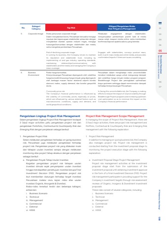 No. KategoriCategory Top Risk Mitigasi/Pengelolaan RisikoRisk Mitigation/Management5 Corporate Image Risiko penurunan corporate image.Dalam menjalankan bisnis, Perusahaan berusaha menjaga reputasi dan kepercayaan stakeholder antara lain dengan menjalankan standar operasi industri migas, menjaga hubungan/komunikasi dengan stakeholder dan media, serta mengelola pemberitaan Perusahaan. Risk of declining corporate image.In running its business, the Company strives to maintain its reputation and stakeholder trust, including by implementing oil and gas industry operating standards, maintaining relationships/communications with stakeholders and the media, and managing the Company's news coverage.Melakukan engagement dengan stakeholder, menyampaikan pemberitaan positif, baik di media massa cetak maupun media online, serta memberikan konfirmasi/laporan apabila ada isu yang beredar. Engages with stakeholders, conveys positive news, both in print mass media and online media, and provides confirmation/reports if there are issues circulating.6 Business Environment Risiko harga komoditas. Kinerja keuangan Perusahaan dipengaruhi oleh volatilitas harga komoditi khususnya harga minyak yang dipengaruhi oleh berbagai macam factor eksternal seperti kondisi ekonomi makro, supply demand, dan kondisi geopolitik dunia. Commodity price risk.The Company's financial performance is influenced by the volatility of commodity prices, especially oil prices, which are influenced by various external factors such as macroeconomic conditions, supply and demand, and world geopolitical conditions.Perusahaan dalam menghadapi risiko uncontrollabletersebut melakukan upaya untuk mengurangi dampak dari volatilitas harga minyak melalui program-program Breakthrough Project dan peningkatan optimalisasi biaya upstream sehingga dapat meminimalisir dampak terhadap kinerja keuangan Perusahaan. In facing this uncontrollable risk, the Company is making efforts to reduce the impact of oil price volatility through Breakthrough Project programs and increasing upstream cost optimization so as to minimize the impact on the Company's financial performance.Pengelolaan Lingkup Project Risk Management Dalam pengelolaan lingkup Project Risk Management terdapat 2 (dua) major activities yaitu pengelolaan project risk dan pengelolaan Portofolio, Contractual & Counterparty Risk dan Emerging Risk dengan penjelasan sebagai berikut:1. Pengelolaan Project Risk Selain melakukan pengelolaan terhadap on-going business risk, Perusahaan juga melakukan pengelolaan terhadap project risk. Pengelolaan project risk yang dilakukan mulai dari tahapan usulan investasi sampai dengan melakukan monitoring atas project tahap eksekusi dengan penjelasan sebagai berikut : a. Pengelolaan Proyek Tahap Usulan Investasi Kegiatan pengelolaan project risk tahapan usulan investasi dimulai sejak penyampaian usulan investasi hingga mendapatkan persetujuan investasi berupa Final Investment Decision (FID). Pengelolaan project riskikut memberikan dukungan terhadap target investasi Perusahaan melalui reviu kajian risiko atas usulan investasi Organik, Anorganik & Divestasi. Risiko-risiko tersebut terdiri dari beberapa kategori, antara lain:i. Business Scenarioii. Technicaliii. Managementiv. Commercialv. Externalvi. HSSEProject Risk Management Scope Management In managing the scope of Project Risk Management, there are 2 (two) major activities, there are project risk management and Portfolio, Contractual & Counterparty Risk and Emerging Risk management with the following explanation:1. Project Risk ManagementIn addition to managing on-going business risk, the Company also manages project risk. Project risk management is conducted starting from the investment proposal stage to monitoring the project execution stage with the following explanation:a. Investment Proposal Stage Project ManagementProject risk management activities at the investment proposal stage start from the submission of the investment proposal until obtaining investment approval in the form of a Final Investment Decision (FID). Project risk management participate in providing support for the Company's investment targets through risk assessment reviews of Organic, Inorganic & Divestment investment proposals.These risks consist of several categories, including:i. Business Scenarioii. Technicaliii. Managementiv. Commercialv. Externalvi. HSSE0102030405 Good Corporate Governance Tata kelola Perusahaan0607 PT Pertamina Hulu Energi 599