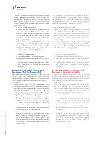 Pada saat melakukan reviu kajian risiko usulan investasi organik, anorganik & divestasi, fungsi project risk management memberikan Project Risk Rating dari usulan proyek tersebut, di mana Project Risk Ratingtersebut menggunakan parameter risk register, capex, dan potential loss.b. Monitoring Proyek Tahap EksekusiMonitoring proyek tahap eksekusi dilakukan sebagai upaya meningkatkan efektivitas pengelolaan dan monitoring risiko proyek di Subholding Upstream. Kegiatan monitoring proyek tahap eksekusi dimulai sejak usulan proyek mendapatkan FID approval sampai dengan project closing.Monitoring risiko proyek dilakukan terhadap seluruh proyek yang sudah mendapatkan persetujuan FID, termasuk didalamnya merupakan proyek prioritas Holding dan Subholding Upstream, dengan kriteria penetapan proyek prioritas sebagai berikut :i. Besaran Capexii. Besaran kontribusi produksiiii. Integrity dan realibility dari fasilitas produksiiv. Start up pada tahun berjalan untuk sumur pemboran dan fasilitas produksi.v. Proyek prioritas berdasarkan penetapan dari ESDM/SKK Migas/Manajemen Persero dan Subholding Upstream.Pengelolaan Portfolio Risk, Contractual & Counterparty Risk dan Emerging Risk Selain pengelolaan risiko eksisting seperti on going business risk dan project risk, manajemen risiko PHE juga telah mengembangkan pengelolaan emerging risk, contractual risk dan counterparty risk dengan penjelasan sebagai berikut: a. Portfolio RiskSecara definisi risiko portofolio dimaksudkan untuk pengelolaan risiko proyek, program kerja, serta portofolio anak perusahaan dan operasional yang dikelola di lingkungan PHE Subholding Upstream untuk mencapai target strategis (strategic obective) yaitu mendapatkan return dengan pengelolaan porfolio pada level yang optimal. Pengelolaan risiko Portofolio fokus pada 2 fokus, yaitu :1. Portofolio Aset dilakukan berdasarkan pemetaan terhadap risk level asset dan tingkat return asset berupa nilai valuasi keekonomian aset (NPV) atau terhadap cadangan (2P + 2C). Hasil pemetaan portfolio assetkemudian dibagi menjadi 4 cluster utama yang memiliki strategi tindak lanjutnya masing-masing.2. Portofolio Proyek dilakukan dilakukan berdasarkan pemetaan terhadap risk level proyek dan tingkat return proyek berupa nilai valuasi keekonomian proyek (NPV) atau terhadap besaran nilai investasi (CAPEX). Hasil pemetaan portofolio proyek menggambarkan risk level status (Positif, Stable ataupun Negatif) dari masingmasing proyek.When conducting a risk assessment review of organic, inorganic and divestment investment proposals, the project risk management function provides a Project Risk Rating for the proposed project, where the Project Risk Rating uses the parameters of risk register, capex and potential loss.b. Monitoring Project Execution PhaseMonitoring The execution stage project is conducted as an effort to improve the effectiveness of project risk management and monitoring in the Upstream Subholding. Monitoring activities for the execution stage project begin when the project proposal receives FID approval until project closing.Monitoring Project risk is conducted on all projects that have received FID approval, including priority projects for holding and upstream subholdings, with the following criteria for determining priority projects:i. Capex Amountii. Amount of production contributioniii. Integrityand reliability of production facilitiesiv. Start upin the current year for drilling wells and production facilities.v. Priority projects based on determination from ESDM/SKK Migas/Persero Management and Upstream Subholding .Portfolio Risk Management, Contractual & Counterparty Risk and Emerging RiskIn addition to managing existing risks such as ongoing business risk and project risk, PHE risk management has also developed management of emerging risks, contractual risks and counterparty risks with the following explanation:a. Portfolio RiskBy definition, portfolio risk is intended for managing project risks, work programs, and subsidiary and operational portfolios managed within the PHE Subholding Upstream environment to achieve strategic objectives, is obtaining returns by managing portfolios at an optimal level.Portfolio risk management focuses on 2 areas, as follows:1. Asset Portfolio is done based on mapping of risk level assets and return levels of assets in the form of asset economic valuation value (NPV) or reserves (2P + 2C). The results of the asset portfolio mapping are then divided into 4 main clusters that have their own followup strategies.2. Project Portfolio is done based on mapping of project risk level and project return level in the form of project economic valuation value (NPV) or investment value (CAPEX). The results of project portfolio mapping describe the risk level status (Positive, Stable or Negative) of each project.Laporan Tahunan %u2022 Annual Report 600HULU ENERGI