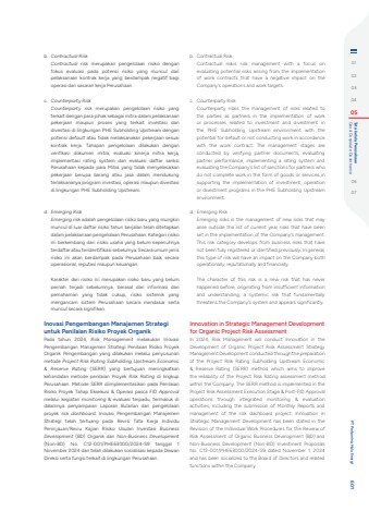 b. Contractual RiskContractual risk merupakan pengelolaan risiko dengan fokus evaluasi pada potensi risiko yang muncul dari pelaksanaan kontrak kerja yang berdampak negatif bagi operasi dan sasaran kerja Perusahaan. c. Counterparty RiskCounterparty risk merupakan pengelolaan risiko yang terkait dengan para pihak sebagai mitra dalam pelaksanaan pekerjaan maupun proses yang terkait investasi dan divestasi di lingkungan PHE Subholding Upstream dengan potensi default atau tidak melaksanakan pekerjaan sesuai kontrak kerja. Tahapan pengelolaan dilakukan dengan verifikasi dokumen mitra, evaluasi kinerja mitra kerja, implementasi rating system dan evaluasi daftar sanksi Perusahaan kepada para Mitra yang tidak menyelesaikan pekerjaan berupa barang atau jasa dalam mendukung terlaksananya program investasi, operasi maupun divestasi di lingkungan PHE Subholding Upstream.d. Emerging RiskEmerging risk adalah pengelolaan risiko baru yang mungkin muncul di luar daftar risiko tahun berjalan telah ditetapkan dalam pelaksanaan pengelolaan Perusahaan. Kategori risiko ini berkembang dari risiko usaha yang belum sepenuhnya terdaftar atau teridentifikasi sebelumya. Secara umum jenis risiko ini akan berdampak pada Perusahaan baik secara operasional, reputasi maupun keuangan.Karakter dari risiko ini merupakan risiko baru yang belum pernah terjadi sebelumnya, berasal dari informasi dan pemahaman yang tidak cukup, risiko sistemik yang mengancam sistem Perusahaan secara mendasar serta muncul secara signifikan.Inovasi Pengembangan Manajemen Strategi untuk Penilaian Risiko Proyek Organik Pada tahun 2024, Risk Management melakukan Inovasi Pengembangan Manajemen Strategi Penilaian Risiko Proyek Organik Pengembangan yang dilakukan melalui penyusunan metode Project Risk Rating Subholding Upstream Economic & Reserve Rating (SERR) yang bertujuan meningkatkan kehandalan metode penilaian Proyek Risk Rating di lingkup Perusahaan. Metode SERR diimplementasikan pada Penilaian Risiko Proyek Tahap Eksekusi & Operasi pasca FID Approvalmelalui kegiatan monitoring & evaluasi terpadu, termasuk di dalamnya penyampaian Laporan Bulanan dan pengelolaan proyek risk dashboard. Inovasi Pengembangan Manajemen Strategi telah tertuang pada Revisi Tata Kerja Individu Peninjauan/Reviu Kajian Risiko Usulan Investasi BusinessDevelopment (BD) Organik dan Non-Business Development (Non-BD) No. C12-001/PHE63000/2024-S9 tanggal 1 November 2024 dan telah dilakukan sosialisasi kepada Dewan Direksi serta fungsi terkait di lingkungan Perusahaan.b. Contractual RiskContractual riskis risk management with a focus on evaluating potential risks arising from the implementation of work contracts that have a negative impact on the Company's operations and work targets.c. Counterparty RiskCounterparty riskis the management of risks related to the parties as partners in the implementation of work or processes related to investment and divestment in the PHE Subholding Upstream environment with the potential for default or not conducting work in accordance with the work contract. The management stages are conducted by verifying partner documents, evaluating partner performance, implementing a rating system and evaluating the Company's list of sanctions for partners who do not complete work in the form of goods or services in supporting the implementation of investment, operation or divestment programs in the PHE Subholding Upstream environment.d. Emerging RiskEmerging risks is the management of new risks that may arise outside the list of current year risks that have been set in the implementation of the Company's management. This risk category develops from business risks that have not been fully registered or identified previously. In general, this type of risk will have an impact on the Company both operationally, reputationally and financially.The character of this risk is a new risk that has never happened before, originating from insufficient information and understanding, a systemic risk that fundamentally threatens the Company's system and appears significantly.Innovation in Strategic Management Development for Organic Project Risk AssessmentIn 2024, Risk Management will conduct Innovation in the Development of Organic Project Risk Assessment Strategy Management Development conducted through the preparation of the Project Risk Rating Subholding Upstream Economic & Reserve Rating (SERR) method which aims to improve the reliability of the Project Risk Rating assessment method within the Company. The SERR method is implemented in the Project Risk Assessment Execution Stage & Post-FID Approval operations through integrated monitoring & evaluation activities, including the submission of Monthly Reports and management of the risk dashboard project. Innovation in Strategic Management Development has been stated in the Revision of the Individual Work Procedures for the Review of Risk Assessment of Organic Business Development (BD) and Non-Business Development (Non-BD) Investment Proposals No. C12-001/PHE63000/2024-S9 dated November 1, 2024 and has been socialized to the Board of Directors and related functions within the Company.0102030405 Good Corporate Governance Tata kelola Perusahaan0607 PT Pertamina Hulu Energi 601