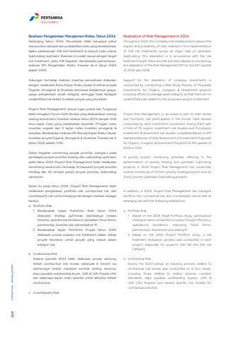 Realisasi Pengelolaan Manajemen Risiko Tahun 2024Sepanjang tahun 2024, Perusahaan telah berupaya untuk menurunkan dampak dan probabilitas risiko yang direalisasikan dalam pelaksanaan 418 risk treatment di seluruh risiko utama Subholding Upstream. Realisasi ini sudah sesuai dengan target risk treatment, yaitu 418 kegiatan. Berdasarkan pemantauan, realisasi KPI Pengelolaan Risiko Triwulan ke-4 tahun 2024 adalah 100%. Dukungan terhadap realisasi investasi perusahaan dilakukan dengan melakukan Reviu Kajian Risiko Usulan Investasi proyek Organik, Anorganik & Divestasi termasuk didalamnya upayaupaya pengelolaan asset integrity sehingga tidak terdapat unidentified risk terkait Investasi proyek yang diusulkan.Project Risk Management sesuai tugas pokok dan fungsinya telah mengikuti Forum Gate Review yang dilaksanakan masing masing koordinator investasi selama tahun 2024 dengan total reviu kajian risiko yang diselesaikan sejumlah 79 kajian risiko investasi organik dan 9 kajian risiko investasi anorganik & divestasi. Berdasarkan realisasi KPI Review Kajian Risiko Usulan Investasi proyek Organik, Anorganik & Divestasi Triwulan ke-4 tahun 2024 adalah 110%.Dalam kegiatan monitoring proyek prioritas, mengacu pada penetapan proyek prioritas holding dan subholding upstream, pada tahun 2024 Project Risk Management telah melakukan monitoring secara rutin terhadap 10 (sepuluh) proyek prioritas Holding dan 40 (empat puluh) proyek prioritas Subholding Upstream. Selain itu pada tahun 2024, Project Risk Management telah melakukan pengelolaan portfolio risk, contractual risk, dan counterparty risk serta emerging risk dengan realisasi sebagai berikut:a. Portfolio Risk1. Berdasarkan kajian Portofolio Aset tahun 2024 dilakukan strategi optimisasi diantaranya melalui efisiensi, operational excellence, perbaikan fiscal terms, partnership, divestasi dan penambahan PI.2. Berdasarkan kajian Portofolio Proyek tahun 2024 dilakukan proses evaluasi risk treatment dalam setiap proyek terutama untuk proyek yang masuk dalam kategori risk.b. Contractual Risk Selama periode 2024 telah dilakukan proses advisoryterkait contractual risk review sebanyak 6 (enam) isu diantaranya terkait standard kontrak drilling services, days payable outstanding buyer, JOA & LDA Proyek LNG dan beberapa kajian risiko spesifik untuk aktivitas terkait contractual.c. Counterparty RiskRealization of Risk Management in 2024Throughout 2024, the Company has endeavored to reduce the impact and probability of risks realized in the implementation of 418 risk treatments across all major risks of Upstream Subholding. This realization is in accordance with the risk treatment target, there are 418 activities. Based on monitoring, the realization of the Risk Management KPI for the 4th Quarter of 2024 was 100%.Support for the realization of company investments is conducted by conducting a Risk Study Review of Proposed Investments for Organic, Inorganic & Divestment projects including efforts to manage asset integrity so that there are no unidentified risks related to the proposed project investment. Project Risk Management, in accordance with its main duties and functions, has participated in the Forum Gate Review conducted by each investment coordinator during 2024 with a total of 79 organic investment risk studies and 9 inorganic investment & divestment risk studies completed.Based on KPI realizationReview of Risk Assessment of Investment Proposals for Organic, Inorganic & Divestment ProjectsThe 4th quarter of 2024 is 110%.In priority project monitoring activities, referring to the determination of priority holding and upstream subholding projects, in 2024 Project Risk Management has conducted routine monitoring of 10 (ten) priority holding projects and 40 (forty) priority Upstream Subholding projects.In addition, in 2024, Project Risk Management has managed portfolio risk, contractual risk, and counterparty risk as well as emerging risk with the following realizations:a. Portfolio Risk1. Based on the 2024 Asset Portfolio study, optimization strategies were conducted including through efficiency, operational excellence, improving fiscal terms, partnerships, divestment and adding PI.2. Based on the 2024 Project Portfolio study, a risk treatment evaluation process was conducted in each project, especially for projects that fall into the risk category.b. Contractual RiskDuring the 2024 period, an advisory process related to contractual risk review was conducted on 6 (six) issues, including those related to drilling services contract standards, days payable outstanding buyers, JOA & LDA LNG Projects and several specific risk studies for contractual activities.Laporan Tahunan %u2022 Annual Report 602HULU ENERGI