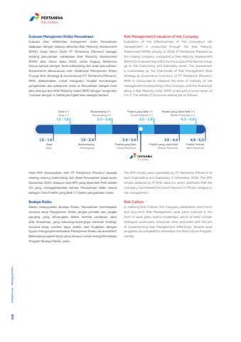 Evaluasi Manajemen Risiko PerusahaanEvaluasi atas efektivitas manajemen risiko Perusahaan dilakukan dengan adanya aktivitas Risk Maturity Assessment(RMA). Pada tahun 2024 PT Pertamina (Persero) sebagai holding perusahaan melakukan Risk Maturity Assessment(RMA) atas Tahun Buku 2023, untuk lingkup Pertamina Group sampai dengan level subholding dan anak perusahaan. Assessment dikoordinasi oleh Direktorat Manajemen Risiko (Fungsi Risk Strategy & Governance) PT Pertamina (Persero). RMA dilaksanakan untuk mengukur tingkat kematangan pengelolaan dan pelaporan risiko di Perusahaan dengan hasil akhir berupa skor Risk Maturity Index (RMI) dengan range skor 1 sampai dengan 5. Detail peringkat skor sebagai berikut: Risk Management Evaluation of the CompanyEvaluation of the effectiveness of the Company's risk management is conducted through the Risk Maturity Assessment (RMA) activity. In 2024, PT Pertamina (Persero) as the holding company conducted a Risk Maturity Assessment (RMA) for Financial Year 2023, for the scope of Pertamina Group up to the Subholding and Subsidiary levels. The assessment is coordinated by the Directorate of Risk Management (Risk Strategy & Governance Function) of PT Pertamina (Persero). RMA is conducted to measure the level of maturity of risk management and reporting in the Company with the final result being a Risk Maturity Index (RMI) score with a score range of 1 to 5. The details of the score ranking are as follows:Hasil RMI disampaikan oleh PT Pertamina (Persero) kepada masing-masing Subholding dan Anak Perusahaan pada bulan Desember 2024. Adapun hasil RMI yang diperoleh PHE adalah 3,5 yang menggambarkan bahwa Perusahaan telah masuk kategori Fase Praktik yang Baik (+) dalam pengelolaan risiko. Budaya RisikoDalam mewujudkan Budaya Risiko, Perusahaan menetapkan rencana kerja Manajemen Risiko jangka pendek dan jangka panjang yang dituangkan dalam bentuk workplan dan/atau Roadmap, yang sekurang-kurangnya memuat strategi, rencana kerja, sumber daya, waktu, dan tingkatan dengan tujuan mengimplementasikan Manajemen Risiko secara efektif. Beberapa program kerja yang disusun untuk menginternalisasi Program Budaya Risiko, yaitu:The RMI results were submitted by PT Pertamina (Persero) to each Subholding and Subsidiary in December 2024. The RMI results obtained by PT PHE were 3.5, which illustrates that the Company has entered the Good Practice (+) Phase category in risk management.Risk CultureIn realizing Risk Culture, the Company establishes short-term and long-term Risk Management work plans outlined in the form of work plans and/or Roadmaps, which at least contain strategies, work plans, resources, time, and levels with the aim of implementing Risk Management effectively. Several work programs are prepared to internalize the Risk Culture Program, namely:1,0 - 1,4AwalEarly1,9 - 2,4BerkembangDeveloping2,9 - 3,4Praktik yang BaikGood Practices3,9 - 4,4Praktik yang Lebih BaikBetter Practices4,9 - 5,0Praktik TerbaikBest PracticesAwal (+)Early (+)1,5 - 1,8Berkembang (+)Developing (+)2,5 - 2,8Praktik yang Baik (+)Good Practice (+)3,5 - 3,8Praktik yang Lebih Baik (+)Better Practices (+)4,5 - 4,8HULU ENERGILaporan Tahunan %u2022 Annual Report 604HULU ENERGI