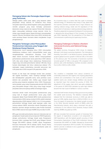 Pemegang Saham dan Pemangku Kepentingan yang Terhormat,Sebagai pelaku usaha pada sektor yang berperan dalam penyediaan energi nasional, PT Pertamina Hulu Energi menyadari sepenuhnya, bahwa kegiatan usaha yang dijalankan memiliki pengaruh yang besar terhadap pemenuhan kebutuhan energi nasional dan aspirasi Pemerintah Indonesia dalam mewujudkan ketahanan energi nasional. Untuk itu, izinkan saya mewakili jajaran Dewan Komisaris menyampaikan Laporan Tahunan Perusahaan tahun buku 2024, terutama dari sudut pandang Dewan Komisaris dalam menjalankan fungsi pengawasannya.Mengelola Tantangan untuk Mewujudkan Perekonomian Indonesia yang Tangguh dan Ketahanan Energi NasionalPerekonomian dunia sepanjang tahun 2024 menunjukkan stabilitasnya meskipun masih memperlihatkan kesan yang mengkhawatirkan. International Monetary Fund (IMF) dalam World Economic Outlook (WEO) memproyeksikan pertumbuhan perekonomian dunia pada tahun 2024 sebesar 3,2%, atau sama dengan tahun sebelumnya. Perekonomian negara maju mencatat pertumbuhan sebesar 1,8% atau hanya tumbuh dibandingkan dari tahun sebelumnya sebesar 1,7%; sedangkan negara berkembang mencatat penurunan dari 4,4% pada tahun 2023 menjadi 4,2% pada tahun 2024.Kondisi ini tak lepas dari berbagai kondisi atas produksi dan logistik komoditas, masih maraknya berbagai konflik dan ketidakpastian geopolitik dunia, serta peristiwa cuaca ekstrem dan perubahan iklim. Deflasi juga menjadi topik penting yang mewarnai perjalanan tahun 2024. Penyesuaian rantai pasokan yang cukup timpang pada periode 2022-2023 yang ditunjukkan dengan inflasi yang cukup tinggi menjadi penyebab utama terciptanya deflasi di berbagai negara.Indonesia sendiri masih menunjukkan perekonomian yang cukup baik di tengah perekonomian dunia yang masih bergejolak. Badan Pusat Statistik (BPS) merilis perekonomian Indonesia tahun 2024 mampu tumbuh 5,03%, sedikit melambat dibanding tahun 2023 sebesar 5,05% (c-to-c). Di sisi produksi, pertumbuhan tertinggi terjadi pada lapangan usaha Jasa Lainnya sebesar 9,80%, sementara Industri Pengolahan yang berperan dominan dengan kontribusi pada Produk Domestik Bruto (PDB) nasional mencapai 18,98% hanya tumbuh 4,43%.BPS juga mencatat pertumbuhan ekonomi Indonesia dari sisi pengeluaran terjadi pada semua komponen PDB Pengeluaran, dengan pertumbuhan tertinggi terjadi pada Pengeluaran Konsumsi Akhir Lembaga Non-Profit yang Melayani Rumah Tangga (PK-LNPRT) sebesar 12,48%; diikuti Pengeluaran Konsumsi Pemerintah (PK-P) sebesar 6,61%. Proses Pemilu serentak dipercaya menjadi faktor pertumbuhan pada sisi pengeluaran.Honorable Shareholders and Stakeholders,As a business actor in a sector that has a part in providing national energy, PT Pertamina Hulu Energi is fully aware that the business activities conducted have a major influence on meeting national energy needs and the aspirations of the Government of Indonesia in realizing national energy resilience. Therefore, please let me represent the Board of Commissioners in delivering the Annual Report of the Company for financial year 2024, especially from the perspective of the Board of Commissioners in performing its supervisory function.Managing Challenges to Realize a Resilient Indonesian Economy and National Energy ResilienceThe global economy throughout 2024 shows its stability, although it still shows a worrying impression. The International Monetary Fund (IMF) in the World Economic Outlook (WEO) projects global economic growth in 2024 at 3.2%, or the same as the previous year. The economies of advanced countries recorded growth of 1.8%, or only grew 1.7% compared to the previous year; while developing countries recorded a decline from 4.4% in 2023 to 4.2% in 2024.This condition is inseparable from various conditions of commodity production and logistics, the ongoing geopolitical conflicts and uncertainties in the world, as well as extreme weather events and climate change. Deflation also became an important topic that colored the journey of 2024. The adjustment of the supply chain which was quite unbalanced in the period of 2022-2023 indicated by quite high inflation became the main cause of deflation in various countries.Indonesia itself remains showing a fairly good economy amidst the volatile world economy. The Statistics Indonesia (BPS) released that the Indonesian economy in 2024 was able to grow by 5.03%, slightly slower than in 2023 at 5.05% (c-to-c). From the aspect of production, the highest growth occurred in the Other Services business sector at 9.80%, while the Manufacturing Industry, which plays a dominant role with a contribution to the national Gross Domestic Product (GDP) reaching 18.98% only grew by 4.43%.BPS also recorded that economic growth of Indonesia from the aspect of expenditure occurred in all components of GDP Expenditure, with the highest growth occurring in Final Consumption Expenditure of Non-Profit Institutions Serving Households (PK-LNPRT) at 12.48%; followed by Government Consumption Expenditure (PK-P) at 6.61%. The simultaneous election process is believed to be a growth factor from the aspect of expenditure.0102 Management Report Laporan Manajemen0304050607Laporan Tahunan %u2022 Annual Report 58PT Pertamina Hulu Energi 59