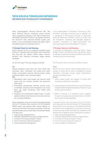 TATA KELOLA TEKNOLOGI INFORMASIINFORMATION TECHNOLOGY GOVERNANCE Dalam penyelenggaraan Teknologi Informasi PHE, Tata Kelola Teknologi Informasi mempunyai peranan penting dalam menjaga kesinambungan IT dan bisnis (IT Alignment), peningkatan Operational Excellence, peningkatan keamanan dan manajemen risiko, kepatuhan terhadap regulasi yang berlaku, inovasi, perkembangan transformasi digital maupun peningkatan kinerja dan kehandalan sistem IT.IT Strategic Objective dan RoadmapDalam mencapai visi dan misi organisasi, penetapan tujuan strategis IT merupakan salah satu langkah untuk memberikan arah yang jelas dan sebagai indikator dalam mengukur kemajuan serta efektivitas pencapaian jangka panjang Perusahaan. Visi dan Misi Fungsi IT tertuang sebagaimana berikut:Visi: Menjadi penggerak utama bisnis dan mitra terbaik bagi Perusahaan dalam memberikan nilai terbaik yang sesuai dengan memanfaatkan teknologi informasi terbaru melalui transformasi digital, inovasi, dan budaya digital.Misi : 1. Menyediakan sistem yang tangguh dan responsif untuk segera pulih dari serangan disruptive dan destructive cyber-attack.2. Pemanfaatan perkembangan Teknologi Informasi untuk memfasilitasi Integrated Data Management dan Solusi Bisnis agar dapat memberikan value terbaik untuk Perusahaan.3. Pengayaan dan pemberdayaan pekerja fungsi IT melalui pelatihan tentang transformasi bisnis, keamanan informasi, dan consulting capabilities. Dalam menjalankan visi dan misi Fungsi IT yang sejalan dengan Visi Misi PT. Pertamina Hulu Energi dan Visi Misi Direktorat SDMPB seperti yang tertuang dalam gambar dibawah ini, maka Fungsi Information Technology menetapkan 5 (lima) key imperatives utama yang menjadi target fokus pengembangan IT ke depan yaitu:1. Cyber Security & Digital Resilince.2. Integrated, Standardized, Innovative, and Agile Solution.3. Innovative Technology and Exploit IT Values.4. Good IT Governance, Risk and Compliance.5. Customer Experience Management. In the implementation of Information Technology of PHE, Information Technology Governance has an important role in maintaining IT and business continuity (IT Alignment), improving Operational Excellence, improving security and risk management, compliance with applicable regulations, innovation, development of digital transformation and improving the performance and reliability of IT systems.IT Strategic Objective and RoadmapIn achieving the organization's vision and mission, setting strategic IT goals is one step to provide clear direction and as an indicator in measuring the progress and effectiveness of the Company's long-term achievements.The IT Function's Vision and Mission are stated as follows:Vision:Become the main business enabler and best partner for the business to deliver best fit value by leveraging the newest Information Technology through digital transformation, innovation, and digital cultureMission:1. Deliver resilient system and response to recover from disruptive and destructive cyber-attack.2. Leveraging & evolving Information Technology for facilitating Integrated Data Management & Business Solutions to give the best value for business.3. Deliver IT Personal as a consultant services capability through training about business transformation, information security and consulting capabilities.In carrying out the vision and mission of the IT Function, which aligns with the Vision and Mission of PT Pertamina Hulu Energi and the Vision and Mission of the SDMPB Directorate as illustrated in the image below, the Information Technology Function has determined 5 (five) Main Key Imperatives which will be the focus targets for future IT development, as follows:1. Cyber Security & Digital Resilience.2. Integrated, Standardized, Innovative, and Agile Solution.3. Innovative Technology and Exploit IT Values.4. Good IT Governance, Risk and Compliance.5. Customer Experience Management.Laporan Tahunan %u2022 Annual Report 608HULU ENERGI