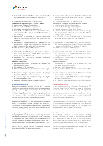 8. Implementasi Standard Platform Aplikasi dan Infrastruktur baru Development Security Operation (DevSecOps)9. Operational Technology (OT) StandardizationRealisasi Innovative Technology & Exploit IT Value1. Implementasi IT System Rejuvenation.2. Integrasi Fundamental Data & Application.3. Penyediaan layanan Upstream Cloud Gen 2.4. Pemanfaatan Analytics for Business Improvement melalui pelaksanaan proof of concept untuk Artificial Intelligence(AI) for Drilling.5. Pemutakhiran IT Porcesses & Controls, penggunaan teknologi Geo-Tagging Monitoring dan Data Lake for Analytics.6. Peningkatan IT Entrepreneurship dan Upskilling Soft Skill Competencies melalui Training English for Business dan Data Management (DMBOK) dan AI Fundamental. Good IT Governance, Risk, and Compliance1. Implementasi Enterprise Architecture.2. Implementasi IT GRC dengan Tailored IT Governance(Tata Kelola berdasarkan COBIT 2019) dan Tailored IT Risk Management Framework.3. Penerapan ISO 22301:2019 Business Continuity Management System. Customer Experiences1. Peningkatan kompetensi Customer Focus & Business danUser Interaction Design.2. Standardisasi UI/UX Dashboard.3. Pelaksanaan IBCD (IT and Business Collaboration Day).4. Pengukuran Tingkat Kepuasan Layanan IT dengan Customer Satisfaction Survey Layanan IT.5. Pengukuran Tingkat maturitas Digital dengan DAI (Digital Acceleration Index) survey.6. Pelaporan SLA (Service Level Agreement) Fungsi IT. Tailoring GovernanceDalam penyelenggaraan Teknologi Informasi di PT. Pertamina Hulu Energi, tata kelola Teknologi Informasi mempunyai peranan penting dalam menjaga kesinambungan IT dan bisnis (IT Alignment), peningkatan Operational Excellence, peningkatan keamanan dan Manajemen Risiko, kepatuhan terhadap regulasi yang berlaku, inovasi, perkembangan transformasi digital maupun peningkatan kinerja dan kehandalan sistem IT.Pelaksanaan Tata kelola IT di PHE menggunakan framework COBIT 2019 merupakan standar framework tata kelola IT (IT Governance) yang memberikan panduan yang komprehensif mengenai proses-proses yang seharusnya dijalankan untuk dapat mengelola IT secara optimal.Kegiatan IT Maturity Assessment merupakan salah satu area yang berfokus pada evaluasi kinerja Fungsi IT dalam menjalankan proses bisnis yang mendukung tujuan IT dan bisnis di PT Pertamina Hulu Energi. Pada tahun 2024 dilakukan kegiatan tailoring governance dengan analisis design factor dan IT Maturity Assessment menggunakan framework COBIT 2019.Melalui aktifitas proses tailoring governance dihasilkan beberapa area COBIT yang akan diprioritaskan.8. Implementation of a Standard Application Platform and New Infrastructure for Development Security Operations (DevSecOps)9. Operational Technology (OT) StandardizationRealization of Innovative Technology & Exploit IT Value1. Implementation IT System Rejuvenation.2. Fundamental Data & Application Integration.3. Provision of Upstream Cloud Gen 2 service.4. Utilization of Analytics for Business Improvement through the implementation of proof of concept for Artificial Intelligence (AI) for Drilling.5. IT Processes & Controls updates, use of Geo-Tagging Monitoring technology and Data Lake for Analytics.6. Improvement of IT Entrepreneurship and Upskilling Soft Skill Competencies through English for Business and Data Management (DMBOK) and AI Fundamental Training.Good IT Governance, Risk, and Compliance1. Implementation of Enterprise Architecture.2. Implementation of IT GRC with Tailored IT Governance (Governance based on COBIT 2019) and Tailored IT Risk Management Framework.3. Implementation of ISO 22301:2019 Business Continuity Management System.Customer Experience1. Improvement of Customer Focus & Business and User Interaction Design competencies.2. Dashboard UI/UX Standardization.3. Implementation of IBCD (IT and Business Collaboration Day).4. Measurement of IT Service Satisfaction Levels with IT Service Customer Satisfaction Surveys.5. Measurement of Digital Maturity Level with DAI (Digital Acceleration Index) survey.6. SLA (Service Level Agreement) Reporting of the IT Function.Tailoring GovernanceIn the implementation of Information Technology at PT Pertamina Hulu Energi, IT governance plays a critical role in ensuring IT and business continuity (IT alignment), enhancing operational excellence, improving security and risk management, ensuring regulatory compliance, driving innovation and digital transformation, as well as increasing IT system performance and reliability.The implementation of IT governance at PHE adopts the COBIT 2019 framework, a recognized standard for IT governance that provides comprehensive guidance on the processes that should be carried out to manage IT effectively.The IT Maturity Assessment is one of the focus areas aimed at evaluating the performance of the IT Function in executing business processes that support IT and business objectives at PT Pertamina Hulu Energi. In 2024, a governance tailoring activity was conducted, involving design factor analysis and an IT Maturity Assessment using the COBIT 2019 framework.Through the tailoring governance process, several COBIT areas have been identified as priorities.Laporan Tahunan %u2022 Annual Report 614HULU ENERGI