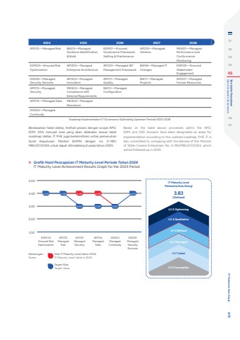 2024 2025 2026 2027 2028APO12%u2014Managed Risk BAI03%u2014Managed Solutions Identification & BuildEDM01%u2014Ensured Governance Framework Setting & MaintenanceAPO10%u2014Managed VendorsMEA01%u2014Managed Performance and Conformance MonitoringEDM03%u2014Ensured Risk OptimizationAPO03%u2014Managed Enterprise ArchitectureAPO01%u2014Managed I&T Management FrameworkBAI06%u2014Managed IT ChangesEDM05%u2014Ensured Stakeholder EngagementDSS05%u2014Managed Security ServicesAPO04%u2014Managed InnovationAPO11%u2014Managed QualityBAI11%u2014Managed ProjectsAPO07%u2014Managed Human ResourcesAPO13%u2014Managed SecurityMEA03%u2014Managed Compliance with External RequirementsBAI10%u2014Managed ConfigurationAPO14%u2014Managed Data MEA04%u2014Managed AssuranceDSS04%u2014Managed ContinuityRoadmap Implementation IT Governance Subholding Upstream Periode 2024-2028Berdasarkan tabel diatas, terlihat proses dengan scope APO, EDM, DSS menjadi area yang akan dilakukan sesuai tabel roadmap diatas. IT PHE juga berkomitmen untuk pemenuhan Surat Keputusan Menteri BUMN dengan no. S-190/MBU/07/2024 untuk dapat ditindaklanjuti pada tahun 2025.Grafik Hasil Pencapaian IT Maturity Level Periode Tahun 2024IT Maturity Level Achievement Results Graph for the 2024 Period4.00 4.00 4.00 4.00 4.003.00 3.00 3.005.004.003.002.001.00EDM 03 Ensured Risk OptimizationKeterangan :Notes:Nilai IT Maturity Level tahun 2024IT Maturity Level Value in 2024Target NilaiTarget ValueAPO13 Managed SecurityAPO14 Managed DataDSS04Managed ContinuityDSS05Managed Security ServicesAPO12Managed RiskLV 1 InitialLV 0 IncompleteLV 2 ManagedLV 3 DefinedLV 4 QualitativeLV 5 OptimizingIT Maturity LevelPertamina Hulu Energi3.83(Defined)Based on the table above, processes within the APO, EDM, and DSS domains have been designated as areas for implementation according to the outlined roadmap. PHE IT is also committed to complying with the Decree of the Minister of State-Owned Enterprises No. S-190/MBU/07/2024, which will be followed up in 2025.0102030405 Good Corporate Governance Tata kelola Perusahaan0607 PT Pertamina Hulu Energi 615