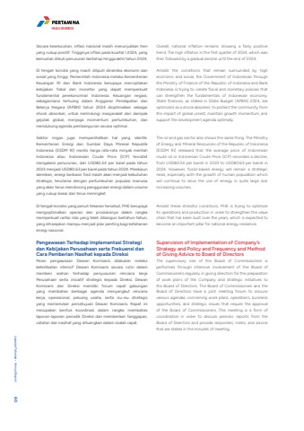 Secara keseluruhan, inflasi nasional masih menunjukkan tren yang cukup positif. Tingginya inflasi pada kuartal I 2024, yang kemudian diikuti penurunan bertahap hingga akhir tahun 2024.Di tengah kondisi yang masih diliputi dinamika ekonomi dan sosial yang tinggi, Pemerintah Indonesia melalui Kementerian Keuangan RI dan Bank Indonesia berupaya menciptakan kebijakan fiskal dan moneter yang dapat memperkuat fundamental perekonomian Indonesia. Keuangan negara, sebagaimana tertuang dalam Anggaran Pendapatan dan Belanja Negara (APBN) tahun 2024 dioptimalkan sebagai shock absorber, untuk melindungi masyarakat dari dampak gejolak global, menjaga momentum pertumbuhan, dan mendukung agenda pembangunan secara optimal.Sektor migas juga memperlihatkan hal yang identik. Kementerian Energi dan Sumber Daya Mineral Republik Indonesia (ESDM RI) merilis harga rata-rata minyak mentah Indonesia atau Indonesian Crude Price (ICP) tercatat mengalami penurunan, dari USD82,54 per barel pada tahun 2023 menjadi USD80,63 per barel pada tahun 2024. Meskipun demikian, energi berbasis fosil masih akan menjadi kebutuhan strategis, terutama dengan pertumbuhan populasi manusia yang akan terus mendorong penggunaan energi dalam volume yang cukup besar dan terus meningkat.Di tengah kondisi yang penuh tekanan tersebut, PHE berupaya mengoptimalkan operasi dan produksinya dalam rangka memperkuat rantai nilai yang telah dibangun bertahun-tahun, yang diharapkan mampu menjadi pilar penting bagi ketahanan energi nasional.Pengawasan Terhadap Implementasi Strategi dan Kebijakan Perusahaan serta Frekuensi dan Cara Pemberian Nasihat kepada DireksiPeran pengawasan Dewan Komisaris dilakukan melalui keterlibatan intensif Dewan Komisaris secara rutin dalam memberi arahan terhadap penyusunan rencana kerja Perusahaan serta inisiatif strategis kepada Direksi. Dewan Komisaris dan Direksi memiliki forum rapat gabungan yang membahas berbagai agenda menyangkut rencana kerja, operasional, peluang usaha, serta isu-isu strategis yang memerlukan persetujuan Dewan Komisaris. Rapat ini merupakan bentuk koordinasi dalam rangka membahas laporan-laporan periodik Direksi dan memberikan tanggapan, catatan dan nasihat yang dituangkan dalam risalah rapat.Overall, national inflation remains showing a fairly positive trend. The high inflation in the first quarter of 2024, which was then followed by a gradual decline until the end of 2024.Amidst the conditions that remain surrounded by high economic and social, the Government of Indonesian through the Ministry of Finance of the Republic of Indonesia and Bank Indonesia is trying to create fiscal and monetary policies that can strengthen the fundamentals of Indonesian economy. State finances, as stated in State Budget (APBN) 2024, are optimized as a shock absorber, to protect the community from the impact of global unrest, maintain growth momentum, and support the development agenda optimally.The oil and gas sector also shows the same thing. The Ministry of Energy and Mineral Resources of the Republic of Indonesia (ESDM RI) released that the average price of Indonesian crude oil or Indonesian Crude Price (ICP) recorded a decline, from USD82.54 per barrel in 2023 to USD80.63 per barrel in 2024. However, fossil-based energy will remain a strategic need, especially with the growth of human population which will continue to drive the use of energy in quite large and increasing volumes.Amidst these stressful conditions, PHE is trying to optimize its operations and production in order to strengthen the value chain that has been built over the years, which is expected to become an important pillar for national energy resilience.Supervision of Implementation of Company%u2019s Strategy and Policy and Frequency and Method of Giving Advice to Board of DirectorsThe supervisory role of the Board of Commissioners is performed through intensive involvement of the Board of Commissioners regularly in giving direction for the preparation of work plans of the Company and strategic initiatives to the Board of Directors. The Board of Commissioners and the Board of Directors have a joint meeting forum to discuss various agendas concerning work plans, operations, business opportunities, and strategic issues that require the approval of the Board of Commissioners. This meeting is a form of coordination in order to discuss periodic reports from the Board of Directors and provide responses, notes, and advice that are stated in the minutes of meeting.HULU ENERGILaporan Tahunan %u2022 Annual Report 60PT Pertamina Hulu Energi 61