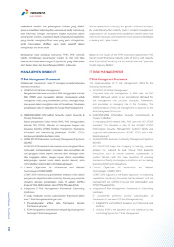 mekanisme deteksi dan penanganan insiden yang efektif guna memastikan keberlanjutan operasional serta melindungi aset informasi. Dengan memahami tingkat maturitas dalam penanganan insiden, organisasi dapat megevaluasi kapabilitas yang dimiliki, mengidentifikasi area yang perlu ditingkatkan, serta menerapkan strategi yang lebih proaktif dalam menghadapi ancaman siber. Berdasarkan hasil penilaian instrumen TMPI, PHE memiliki indeks kematangan penanganan insiden di nilai 4,61 atau berada pada level kematangan 5 (optimize) yang dikeluarkan oleh Badan Siber dan Sandi Negara (BSSN) Indonesia. MANAJEMEN RISIKO ITIT Risk Management FrameworkPelaksanaan manajemen risiko TI mengacu kepada beberapa framework berikut:a. ISO31000:2018 Risk ManagementPengelolaan risiko level korporat di PHE menggunakan standar ISO 31000 yang merupakan standar internasional untuk manajemen risiko yang memberikan prinsip, kerangka kerja, dan proses dalam mengelola risiko di Perusahaan. Penerapan pengelolaan risiko ini dilaporkan ke Fungsi Risk Management. b. ISO27005:2022 Information Security, Cyber Security & Privacy ProtectionDalam pengelolaan risiko terkait ISMS, PHE menggunakan standar ISO 27005. Standar ini merupakan bagian dari keluarga ISO/IEC 27000 (Sistem Manajemen Keamanan Informasi) dan mendukung penerapan ISO/IEC 27001 dengan pendekatan berbasis risiko. c. ISO22301:2019 Business Continuity Management Systems (BCMS)ISO 22301:2019 membantu Perusahaan untuk mengidentifikasi, mencegah, mempersiapkan, merespon, dan memulihkan diri dari gangguan bisnis, seperti bencana alam, serangan siber, atau kegagalan sistem, dengan tujuan utama memastikan kelangsungan operasi bisnis dalam kondisi darurat, serta meningkatkan resiliensi bisnis terhadap gangguan. d. Control Objectives for Information and Related Technologies (COBIT) 2019COBIT 2019 mendukung pendekatan berbasis risiko dalam pengukuran kapabilitas atau maturity. Proses yang memiliki relevansi dengan pengelolaan risiko TI adalah EDM03 Ensured Risk Optimization dan APO12 Managed Risk. e. Integrated IT Risk Management Framework Subholding Upstream.IT selalu melakukan control customization framework dalam area IT Risk Management dengan cara : 1. Menghubungkan antara satu framework dengan framework yang lain.2. EDM risk appetite, risk tolerance menjadi figure pengontrol terhadap IT Risk Management.ensure operational continuity and protect information assets. By understanding the maturity level in incident management, organizations can evaluate their capabilities, identify areas that need to be improved, and implement more proactive strategies in dealing with cyber threats.Based on the results of the TMPI instrument assessment, PHE has an incident handling maturity index of 4.61 or is at maturity level 5 (optimize) issued by the Indonesian National Cyber and Crypto Agency (BSSN). IT RISK MANAGEMENTIT Risk Management FrameworkThe implementation of IT risk management refers to the following frameworks:a. ISO31000:2018 Risk ManagementCorporate level risk management at PHE uses the ISO 31000 standard, which is an international standard for risk management that provides principles, frameworks, and processes in managing risk in the Company. The implementation of this risk management is reported to the Risk Management Function.b. ISO27005:2022 Information Security, Cybersecurity & Privacy ProtectionIn managing ISMS-related risks, PHE uses the ISO 27005 standard. This standard is part of the ISO/IEC 27000 (Information Security Management System) family and supports the implementation of ISO/IEC 27001 with a riskbased approach.c. ISO22301:2019 Business Continuity Management Systems (BCMS)ISO 22301:2019 helps the Company to identify, prevent, prepare for, respond to and recover from business disruptions, such as natural disasters, cyberattacks or system failures, with the main objective of ensuring business continuity in emergency situations, and increasing business resilience to disruptions.d. Control Objectives for Information and Related Technologies (COBIT) 2019COBIT 2019 supports a risk-based approach to measuring capabilities or maturity. Processes that are relevant to IT risk management are EDM03 Ensured Risk Optimization and APO12 Managed Risk.e. Integrated IT Risk Management Framework of Subholding Upstream.IT consistently performs control customization of frameworks in the area of IT Risk Management by:1. Establishing connections between one framework and another.2. Utilizing EDM's risk appetite and risk tolerance as key controlling figures for IT Risk Management.Laporan Tahunan %u2022 Annual Report 618HULU ENERGI