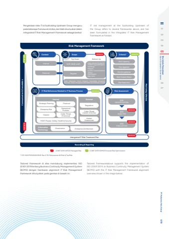 Tailored Framework di atas mendukung implementasi ISO 22301:2019 tentang Business Continuity Management System (BCMS) dengan Gambaran alignment IT Risk Management Framework ditunjukkan pada gambar di bawah ini:Tailored Frameworkabove supports the implementation of ISO 22301:2019 on Business Continuity Management System (BCMS) with the IT Risk Management Framework alignment overview shown in the image beloMonitoring & ReviewCOBIT 2019-APO12 Managed Risk COBIT 2019-EDM03 Ensured Risk Optimization* C12-002/PHE41000/2022 Rev.0 TKI Penyusunan All Risk & Top Risk%u2022Data collection (Incident & Problem Log, Audit Report, EventLog)%u2022Projects%u2022ICoFR-IT General Control (ITGC)%u2022Risk Register%u2022Blue TeamAudit Independen, Threat Intelligent, Vulnerability, Assesment, Red Team, Sistem Manajemen (ISO 22301, ISO 27001,etc.), HazardIntergrated IT Risk Treatment PlanRJPP, RKAP, & KPIRegulasiRisk AppetiteRisk CapacityRisk AcceptanceRisk Criteria MatrixRisk ReductionIT Risk References Related to IT Business ProcessInternal ExternalScope Criteria*Risk AssessmentStrategic PlanningGovernance Enterprise ArchitectureEnterprise RiskHSSE (People, Safety, Health & SecurityFinancialRegulationCyber Threat Industri Oil & GasArahan StakeholderOperasional ProduksiHazard Cyber Threat (Historical)InformationTechnologyRISK IDENTIFICATIONRISK ANALYSISRISK EVALUATIONRisk Management FrameworkCommunication & ConsultationRecording & ReportingAPO12.01 EDM03.01APO12.02EDM03.02EDM 03.02 APO12.04APO12.03APO12.05ContextTop-Down Bottom-UpEksternalInternalPengelolaan risiko TI di Subholding Upstream Group mengacu pada beberapa framework di atas, dan telah dirumuskan dalam Integrated IT Risk Management Framework sebagai berikut: IT risk management at the Subholding Upstream of the Group refers to several frameworks above, and has been formulated in the Integrated IT Risk Management Framework as follows:0102030405 Good Corporate Governance Tata kelola Perusahaan0607 PT Pertamina Hulu Energi 619