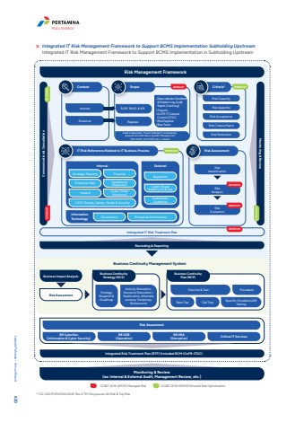 Integrated IT Risk Management Framework to Support BCMS Implementation Subholding UpstreamIntegrated IT Risk Management Framework to Support BCMS Implementation in Subholding UpstreamCOBIT 2019-APO12 Managed Risk COBIT 2019-EDM03 Ensured Risk Optimization* C12-002/PHE41000/2022 Rev.0 TKI Penyusunan All Risk & Top Risk%u2022Data collection (Incident & Problem Log, Audit Report, EventLog)%u2022Projects%u2022ICoFR-IT General Control (ITGC)%u2022Risk Register%u2022Blue TeamIntergrated IT Risk Treatment PlanInternalEksternalRJPP, RKAP, & KPIRegulasiAudit Independen, Threat Intelligent, Vulnerability, Assessment, Red Team, System Management (ISO 22301, ISO 27001,etc.), HazardRisk CapacityRisk AppetiteRisk AcceptanceRisk Criteria MatrixRisk ReductionContextIT Risk References Related to IT Business ProcessInternal ExternalScope Criteria*Risk AssessmentStrategic PlanningGovernance Enterprise ArchitectureEnterprise RiskHSSE (People, Safety, Health & SecurityFinancial RegulationCyber Threat Industry Oil & GasStakeholder GuidelinesOperational ProductionHazard Cyber Threat (Historical)InformationTechnologyRisk IdentificationRisk AnalysisRisk EvaluationRisk Management FrameworkCommunication & ConsultationRecording & ReportingMonitoring & Review(ex: Internal & External Audit, Management Review, etc.)Monitoring & ReviewAPO12.01 EDM03.01APO12.02EDM03.02EDM03.02 APO12.04 EDM 03.03APO12.03APO12.05Integrated Risk Treatment Plan (RTP) (Included RCM-ICoFR-ITGC)Risk AssessmentRR CyberSec(Information & Cyber Security)RR OGB(Operation)RR DRA(Disruptive) Critical IT ServicesBusiness Continuity Strategy (BCS)Strategy Blueprint & RoadmapActivity Relocation, Resource Relocation /Reallocation, Alternate process, Temporary WorkaroundBusiness Continuity Plan (BCP)Exercise & Test ProcedureTabel Top Call Tree Specific Simulation/DR TestingBusiness Continuity Management SystemBusiness Impact AnalysisRisk AssessmentLaporan Tahunan %u2022 Annual Report 620HULU ENERGI