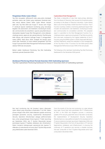 Dari hasil monitoring top risk tersebut, belum ditemukan cyber attack yang menembus infrastruktur TI di PHE. Dalam proses mitigasi risiko 2024, telah dilakukan update versioning perangkat parameter security, implementasi Development Security Operation (DevSecOps) sebagai platform/media baru untuk pengembangan Solusi layanan IT telah launching per September 2024, dan IT System Rejuvenate berupa peremajaan layanan IT (aplikasi, database, dan infrastruktur). Dalam menjamin kelangsungan operasional dan layanan TI, dilakukan uji coba disaster recovery atas IT System Rejuvenateyang dilaksanakan pada Desember 2024. Dashboard Monitoring Attack Periode Desember 2024 Subholding UpstreamTop Risk Cyberattack Monitoring Dashboard for Period of December 2024 of Subholding UpstreamPengelolaan Risiko Cyber AttackTop Risk merupakan daftar/profil risiko yang perlu mendapat perhatian utama dari Direksi yang melampaui threshold dan/atau sesuai diskresi Direksi. Risiko Cyber Attack menjadi salah satu Top Risk 2024 dari Fungsi IT. Secara rutin Fungsi IT membuat laporan dashboard monitoring yang mencakup kegiatan risk assessment, risk treatment, monitoring & review, dan communication & consultation. Laporan yang telah disusun disampaikan kepada Fungsi Risk Management untuk dilakukan challenge session, approval, dan upload dokumen Top Risk yang telah ditinjau oleh pimpinan tertinggi Fungsi IT menggunakan sistem ERMS. Pada tahun 2024, terdapat 46 (empat puluh enam) Risk Treatment, di mana realisasi pengelolaan Top RiskFungsi IT periode 2024 (Risk Management Performance) adalah sebesar 100% dari annual plan. Berikut adalah Dashboard Monitoring Top Risk Subholding Upstream periode Desember 2024:Cyberattack Risk ManagementTop Riskis a list/profile of risks that need primary attention from the Board of Directors that exceed the threshold and/or according to the Board of Directors' discretion. Cyber Attack Risk is one of the Top Risks in 2024 from the IT Function. The IT Function routinely creates a monitoring dashboard report that includes risk assessment, risk treatment, monitoring & review, and communication & consultation activities. The prepared report is submitted to the Risk Management Function for a challenge session, approval, and upload of Top Risk documents that have been reviewed by the highest leadership of the IT Function using the ERMS system. In 2024, there were 46 (fortysix) Risk Treatments, where the realization of the management of the Top Risk of the IT Function for the 2024 period (Risk Management Performance) was 100% of the annual plan.The following is the Upstream Subholding Top Risk Monitoring Dashboard for the December 2024 period:From the results of the top risk monitoring, no cyber attacks have been found that have penetrated the IT infrastructure at PHE. In the 2024 risk mitigation process, a versioning update of the security parameter device has been conducted, the implementation of Development Security Operation (DevSecOps) as a new platform/media for the development of IT service solutions has been launched in September 2024, and IT System Rejuvenate in the form of rejuvenation of IT services (applications, databases, and infrastructure). In ensuring the continuity of IT operations and services, a disaster recovery trial was conducted on the IT System Rejuvenate which was conducted in December 2024.0102030405 Good Corporate Governance Tata kelola Perusahaan0607 PT Pertamina Hulu Energi 621