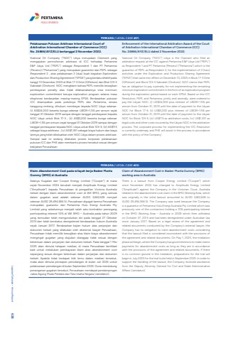 PERKARA / LEGAL CASE #01: Pelaksanaan Putusan Arbitrase Internasional Court of Arbitration International Chamber of Commerce (ICC) No. 24866/AYZ/ELU bertanggal 2 November 2022.Enforcement of the International Arbitration Award of the Court of Arbitration International Chamber of Commerce (ICC) No. 24866/AYZ/ELU dated 2 November 2022.National Oil Company (%u201cNOC%u201d) Libya merupakan Claimant yang mengajukan permohonan arbitrase di ICC terhadap Pertamina E&P Libya Ltd (%u201cPEPL%u201d) sebagai Respondent 1 dan PT Pertamina (Persero) (%u201cPertamina%u201d) yang merupakan guarantor dari PEPL sebagai Respondent 2 , atas pelaksanaan 2 (dua) buah kegiatan Explorationdan Production Sharing Agreement (%u201cEPSA%u201d) yang berlaku efektif pada tanggl 10 Desember 2005 di Blok 17-3 Sirte (Offshore) dan Blok 123-3 Sabratah (Onshore). NOC mengklaim bahwa PEPL memiliki kewajiban pembayaran penalty atas tidak dilaksanakannya sisia minimum exploration commitment berupa exploration program selama masa eksplorasi berdasarkan masing-masing EPSA. Berdasarkan putusan ICC disampaikan pada pokoknya PEPL dan Pertamina, secara tanggung renteng, dihukum membayar kepada NOC Libya sebesar: (i) AS$24,000 beserta bunga sebesar LIBOR+1,5% per annum sejak tanggal 31 Oktober 2019 sampai dengan tanggal pembayaran kepada NOC Libya untuk Blok 17-3 ; (ii) AS$5,200 beserta bunga sebesar LIBOR+1,5% per annum sejak tanggal 31 Oktober 2019 sampai dengan tanggal pembayaran kepada NOC Libya untuk Blok 123-3; (iii) AS$113 sebagai biaya arbitrase ; (iv) AS$1,351 sebagai biaya hukum dan biaya lainnya yang telah dikeluarkan oleh NOC Libya dalam proses arbitrase. Sampai saat ini sedang dilakukan proses korporasi pelaksanaan putusan ICC dan PHE akan membantu proses tersebut sesuai dengan kebijakan Perusahaan.National Oil Company (%u201cNOC%u201d) Libya is the Claimant who filed an arbitration request at the ICC against Pertamina E&P Libya Ltd (%u201cPEPL%u201d) as Respondent 1 and PT Pertamina (Persero) (%u201cPertamina%u201d) which is the guarantor of PEPL as Respondent 2, for the implementation of 2 (two) activities under the Exploration and Production Sharing Agreement (%u201cEPSA%u201d) that came into effect on December 10, 2005 in Block 17-3 Sirte (Offshore) and Block 123-3 Sabratah (Onshore). NOC claims that PEPL has an obligation to pay a penalty for not implementing the remaining minimum exploration commitment in the form of an exploration program during the exploration period based on each EPSA. Based on the ICC Resolution, PEPL and Pertamina, jointly and severally, were ordered to pay the Libyan NOC: (i) US$24,000 plus interest of LIBOR+1.5% per annum from October 31, 2019 until the date of payment to the Libyan NOC for Block 17-3; (ii) US$5,200 plus interest of LIBOR+1.5% per annum from October 31, 2019 until the date of payment to the Libyan NOC for Block 123-3; (iii) US$113 as arbitration costs; (iv) US$1,351 as legal costs and other costs incurred by the Libyan NOC in the arbitration process. The corporate process for implementing the ICC Resolution is currently underway and PHE will assist in the process in accordance with the policy of the Company%u2019.PERKARA / LEGAL CASE #02: Klaim Abandonment Cost pada wilayah kerja Basker Manta Gummy (BMG) di AustraliaClaim of Abandonment Cost in Basker Manta Gummy (BMG) working area in AustraliaAdanya Gugatan dari Cooper Energy Limited (%u201cCooper%u201d) di mana sejak November 2024 berubah menjadi Amplitude Energy Limited (%u201cAmplitude%u201d) kepada Perusahaan di pengadilan Victoria Australia terkait dengan klaim abandonment cost di WK BMG, yang semula dalam gugatan awal adalah sebesar AUSD 3,662,626 menjadi sebesar AUSD 29,494,566.14. Perusahaan digugat karena Perusahaan merupakan guarantor dari Pertamina Hulu Energi Australia Pty Limited yang sebelumnya menjadi salah satu kontraktor pemegang participating interest 10% di WK BMG %u2013 Australia pada tahun 2009 yang kemudian telah mengundurkan diri pada tanggal 27 Oktober 2013 dan telah berstatus deregistered berdasarkan hukum Australia sejak Januari 2017. Berdasarkan kajian hukum atas perjanjian dan dokumen terkait yang dilakukan oleh eksternal lawyer Perusahaan, Perusahaan tidak memiliki kewajiban atas klaim biaya abandonment mengingat gugatan yang diajukan dianggap tidak sesuai dengan ketentuan dalam perjanjian dan dokumen terkait. Pada tanggal 1 Mei 2025 akan dimulai tahapan mediasi, di mana Perusahaan beritikad baik untuk melakukan pembayaran klaim atas abandonment cost sepanjang sesuai dengan ketentuan dalam perjanjian dan dokumen terkait. Apabila tidak terdapat titik temu dalam mediasi tersebut, maka akan dimulai persiapan persidangan di bulan Juli 2025 untuk pelaksanaan persidangan di bulan September 2025. Guna mendukung penanganan gugatan tersebut, Perusahaan mendapat pendampingan Jaksa Agung Muda Perdata dan Tata Usaha Negara (Jamdatun).There is a lawsuit from Cooper Energy Limited (%u201cCooper%u201d) which since November 2024 has changed to Amplitude Energy Limited (%u201cAmplitude%u201d) against the Company in the Victorian Court, Australia related to the abandonment cost claim in the BMG Working Area, which was originally in the initial lawsuit amounted to AUSD 3,662,626 to AUSD 29,494,566.14. The Company was sued because the Company is a guarantor of Pertamina Hulu Energi Australia Pty Limited which was previously one of the contractors holding a 10% participating interest in the BMG Working Area %u2013 Australia in 2009 which then withdrew on October 27, 2013 and had been deregistered under Australian law since January 2017. Based on a legal review of the agreement and related documents conducted by the Company's external lawyer, the Company has no obligation to claim abandonment costs considering that the lawsuit filed is considered inconsistent with the provisions of the agreement and related documents. On May 1, 2025, the mediation phase will begin, where the Company has good intentions to make cla