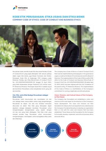 Perusahaan telah memiliki Kode Etik atau Kode Perilaku (Code of Conduct/CoC) yang wajib diterapkan oleh seluruh pekerja dalam organ tata kelola, juga Dewan Komisaris dan Direksi. Penerapan Kode Etik di lingkungan PHE mengacu pada Pedoman Perilaku dan Etika Bisnis/Code of Conduct (CoC) No. A13-005/PHE01000/2022-S9 tanggal 10 April 2023, yang telah diselaraskan dengan Pedoman CoC entitas induk, PT Pertamina (Persero). Penerapan Kode Etik ini adalah wujud dari komitmen Perusahaan untuk menjalankan bisnis yang sah dan beretika. Visi, Misi, serta Nilai Budaya Perusahaan sebagai Dasar UtamaPerusahaan telah merumuskan dan menetapkan visi dan misi sebagai dasar utama dalam arahan bagi pengembangan Perusahaan ke depan. Visi dan misi tersebut kemudian diturunkan ke dalam Tata Nilai yang diharapkan dapat dipahami sebagai kebijakan mendasar Perusahaan untuk mengembangkan keorganisasian yang sejalan dengan visi dan misi yang telah ditetapkan. Tata Nilai inilah yang menjadi pondasi bagi Perusahaan untuk merumuskan, mengembangkan, menerapkan, serta menegakkan etika usaha dan etika kerja.The company has a Code of Ethics or Code of Conduct (CoC) that must be implemented by all employees in the governance organs, as well as the Board of Commissioners and the Board of Directors. The implementation of the Code of Ethics within PHE refers to the Code of Conduct and Business Ethics/Code of Conduct (CoC) No. A13-005/PHE01000/2022-S9 dated April 10, 2023, which has been aligned with the CoC Guidelines of the parent entity, PT Pertamina (Persero). The implementation of this Code of Ethics is a manifestation of the Company's commitment to running a legitimate and ethical business.Vision, Missions, and Cultural Values of the Company as Main BasesThe Company has formulated and established a vision and missions as the main bases for the direction of the Company's future development. The vision and missions are then translated into Values which are expected to be understood as the Company's fundamental policy to develop an organization that is in line with the vision and missions that have been established. These Values are the foundation for the Company to formulate, develop, implement, and enforce business ethics and work ethics.KODE ETIK PERUSAHAAN: ETIKA USAHA DAN ETIKA BISNIS COMPANY CODE OF ETHICS: CODE OF CONDUCT AND BUSINESS ETHICSVisi & MisiVision & MisionTata NilaiCulture Values Kode EtikCode of EthicsLaporan Tahunan %u2022 Annual Report 628HULU ENERGI